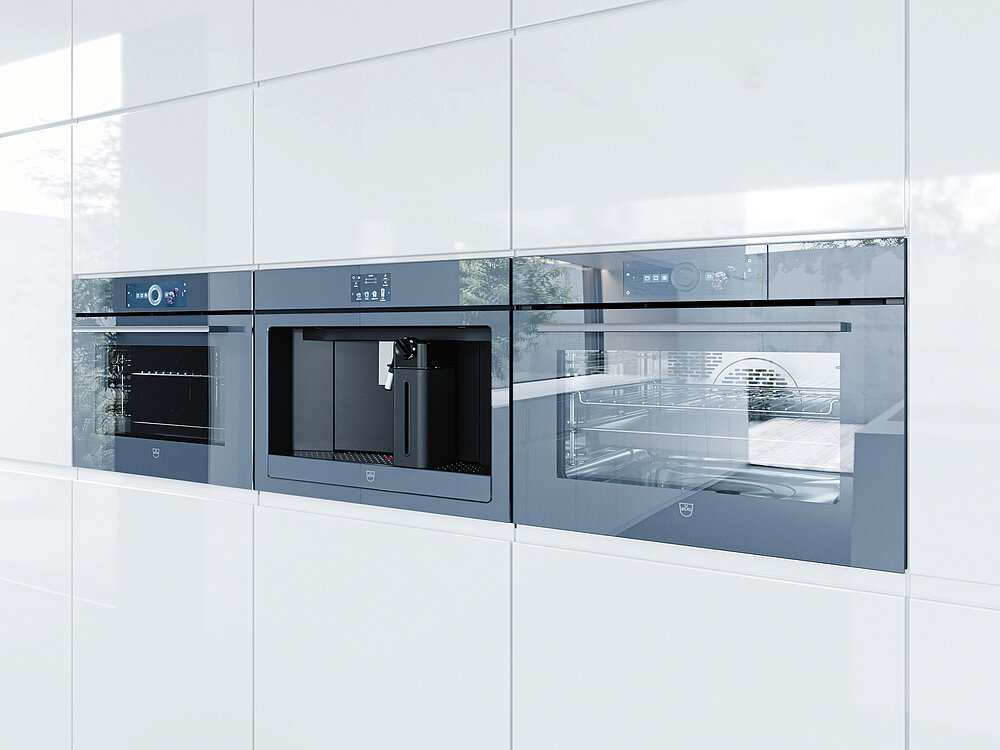 Gutes Design spricht stets mehrere Aspekte der Wahrnehmung an. Bei der Gestaltung der Küchengeräte der Excellence Line mit Kaffeemaschine, Steamer, Ofen und Weinkühler stand die Maxime der Vereinigung von Gegensätzen im Vordergrund. Sie verwirklicht die Vorstellung, Emotionen auf präzise Technik treffen zu lassen: „Warm trifft auf kalt, weiche Elemente auf harte.“ Formal voller Widersprüche, muten diese Geräte dennoch harmonisch an. Ausgewogenheit bestimmt die Gestaltungssprache, Gegensätze reizen die Sinne und emotionalisieren. Die Entscheidung für ein griffloses Design war dabei geleitet von dem Wunsch nach einem Maximum an Purismus. Diese Geräte sollen von den Nutzern visuell wie auch haptisch erfahren werden. Sind sie ausgeschaltet, nehmen sie sich im Raum so weit wie nur möglich zurück, treten in den Hintergrund und drängen sich nicht auf. Eingeschaltet hingegen zeigen sie eine markante Präsenz. Ein zentraler Aspekt ist das großzügig gestaltete Display, welches als „Seele“ dieser Geräte definiert ist. Es bietet eine überaus komfortable Bedienung über den CircleSlider, Produkt- und User-Interface-Design gehen dabei eine perfekte Symbiose ein. Der CircleSlider erleichtert im eingeschalteten Zustand das Verstellen von Werten. Im ausgeschalteten Zustand erzeugt er als starkes Markenmerkmal ein unverkennbares, ikonisches Bild. Viele Möglichkeiten der Individualisierung erlauben es dem Nutzer, die Geräte seinen Bedürfnissen entsprechend einzurichten.