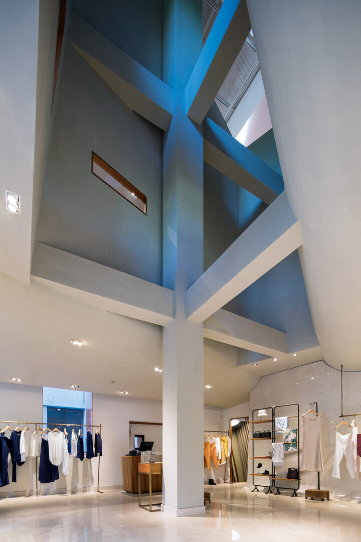 The flagship store of fashion house Exception in Shanghai extends over three floors. Creating the impression of an open space, a light shaft interconnects the various levels. This hollow space also takes on the impression of a curtain with folds. Natural light projected down through the light channel changes the atmosphere in the entire store. In addition, the open architecture visually exposes the frame structure of the building. The supporting pillars look like a tree with branches, representing nature’s vitality, which forms the essence of the brand identity.