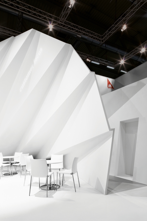 With the motto “expand to a new level”, this presentation at the interzum 2011 demonstrated the innovative potential of paper and made it perceptible to the senses, all within the brand architecture. Based on the paper manufacturer’s new “Made by Munksjö” logo, which shows a folded edge in the upper right corner, a sheet was folded according to this constructive principle in a reverse rhythm and developed into a room. With the regularity of the golden ratio, the fold opened a dynamic sculpture emerging from itself.