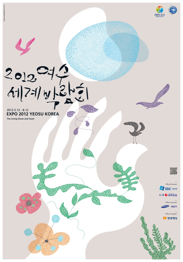 The design of these two posters represent the vision of the EXPO 2012 in Yeosu, “The Living Ocean and Coast”, in focusing on the relationship between man and nature as a theme. The lifeline of the human hand symbolises the idea of a new beginning, which becomes possible through wise utilisation and protection of the earth. The second poster uses the symbol for Yeosu, the camellia, and combines it with the organic shape of two merging bodies. These again symbolise the connection between the sea and the coast.