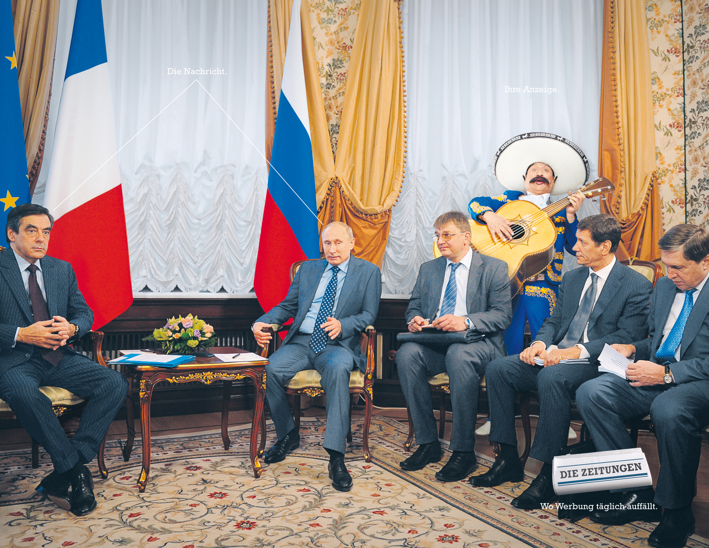 This print campaign was developed for ZMG, the German Newspaper Marketing Association. With a unique image language, the campaign proves in a highly entertaining way how much attention can be created through newspaper advertisements. The objective of the campaign was to convince potential clients and advertisers, from local to national level, to invest their advertising money in newspaper ads. Accordingly, press photos of international significance were edited with startling additional elements, which are in a humorous sense entirely out of context, skilfully exaggerating the hidden humour of the political events.