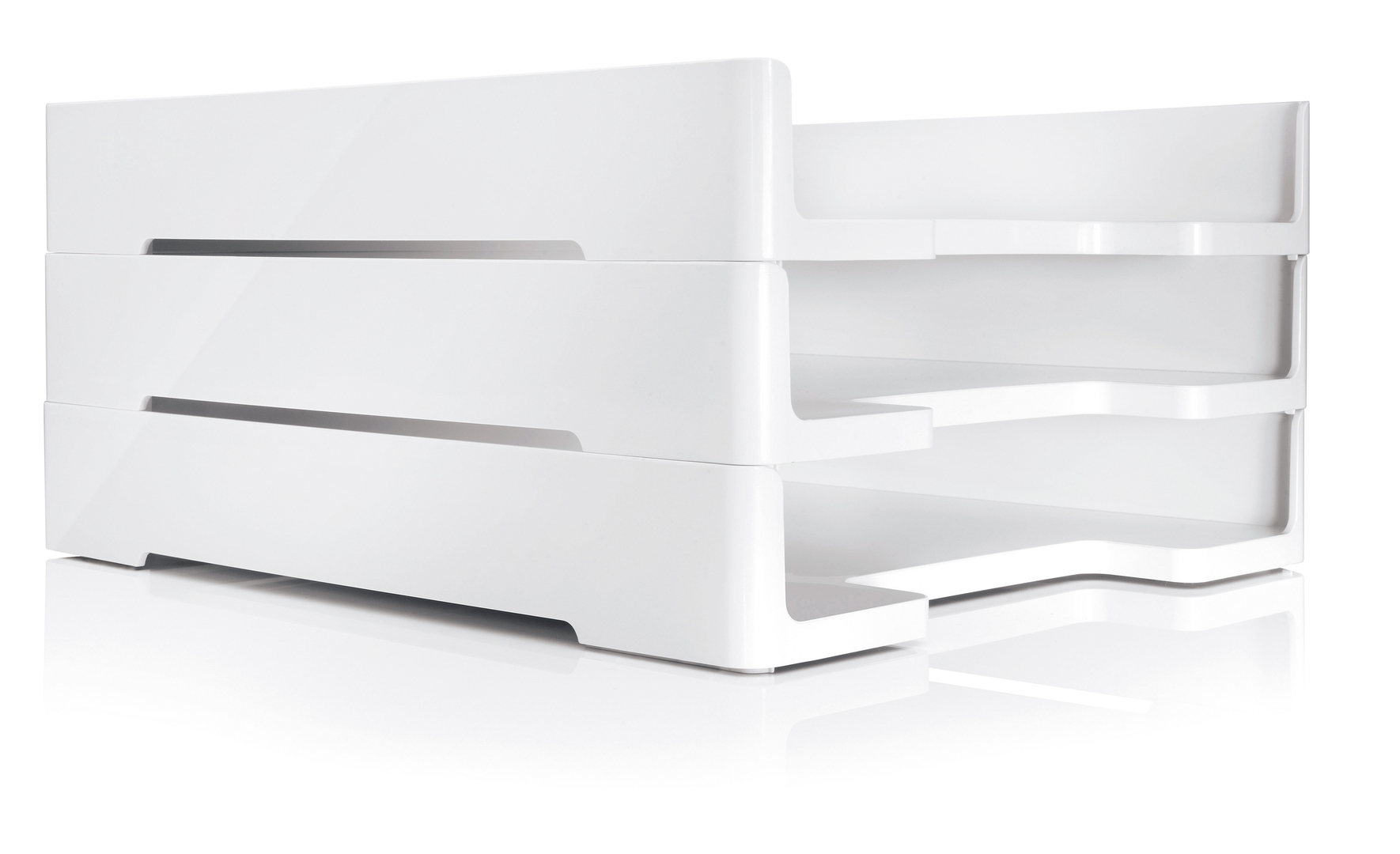 Die Briefablage und der Stehsammler eyestyle sind schlicht und formschön entworfene Schreibtisch-Accessoires, die den Arbeitsalltag ordnen und erleichtern. Ihre moderne, abgerundete Formgebung in High-Gloss-Optik und ihre Fertigung aus stabilem, hochwertigem ABS-Kunststoff verbinden Design und Funktion auf hervorragende Weise. In den Trendfarben White, Violet und Berry verfügbar, bewahren sie wichtige Unterlagen griffbereit und stilvoll auf. Die Briefablage kann sowohl einzeln als auch aufeinander oder versetzt gestapelt eingesetzt werden.