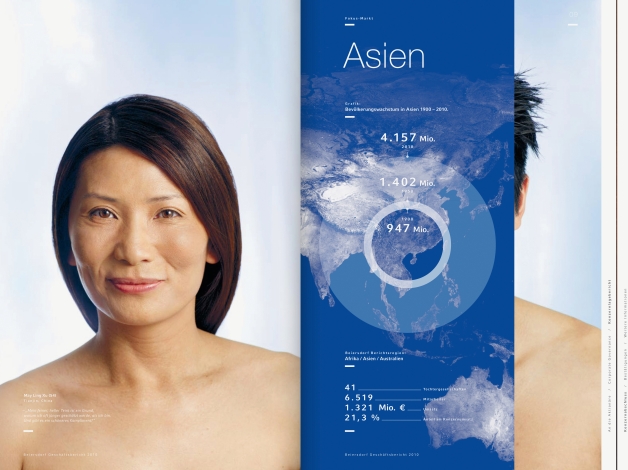 With the new business strategy “Focus on Skin Care. Closer to Markets”, the 2010 annual report aims to raise Beiersdorf’s profile. The title refers to the 100th anniversary of the Nivea brand. Inside the report an inventive visual language vividly illustrates the presentation of the annual results. In addition, six eye-catching portraits convey different consumer expectations of ideal skin care. Short text passages point to the regional characteristics of the respective market. This is complemented by employees who give an insight into their particular field of work.