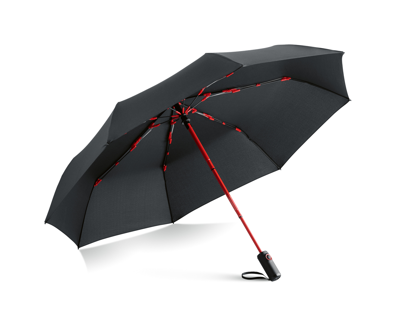 Bei diesem Taschenschirm in Übergröße kehrt die Farbe der Auslösetaste in den Gelenken und im mehrteiligen Stock wieder. Dank eines patentierten Systems ist der Stahlstock gegen Kratzer geschützt. Fiberglasschienen sorgen dafür, dass der Schirm sich nach dem Umschlagen durch zu starken Wind gleich wieder schließen und einsetzen lässt. Der Bezug besteht aus Polyester-Pongee. Bei der Herstellung dieses recycelten Stoffes wird bereits das Garn durchgefärbt, was den CO₂-Ausstoß senkt, Energie und Wasser spart.