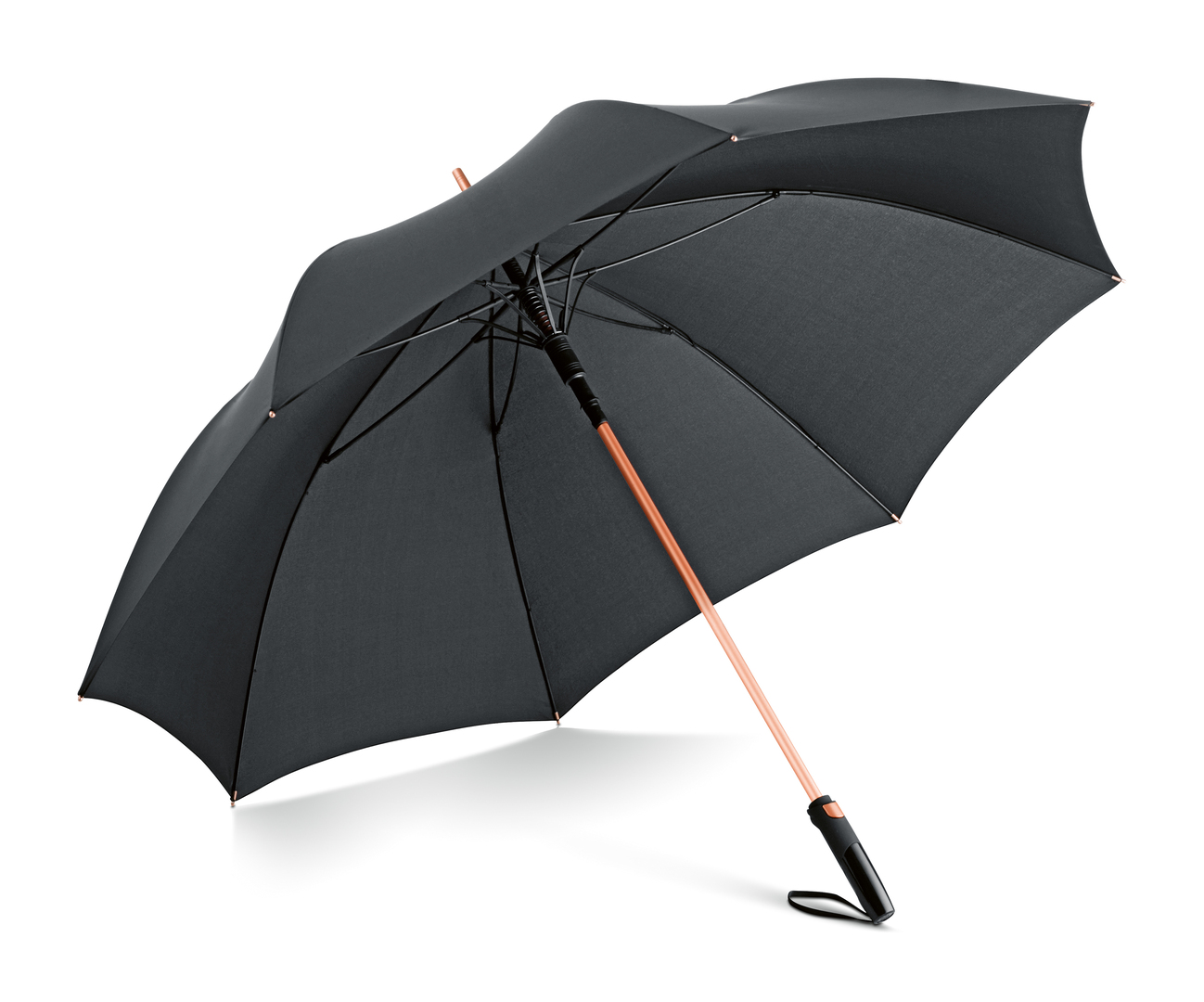 Ein schwarzer oder weißer Bezug ist bei diesem Schirm mit einem matten Aluminiumstock in Gold oder Kupfer kombiniert. Details wie ein Druckknopf am Schließband und passende Metallspitzen runden das edle Gesamtbild ab. Durch Druck auf die Auslösetaste öffnet sich ein ausladendes Dach. Ein Fiberglasgestell macht den Schirm sehr stabil; nach Umschlagen durch zu starken Wind lässt er sich leicht wieder schließen. Am ergonomisch geformten Griff treffen mattes Soft-Touch-Material und schwarz glänzender Kunststoff aufeinander.
