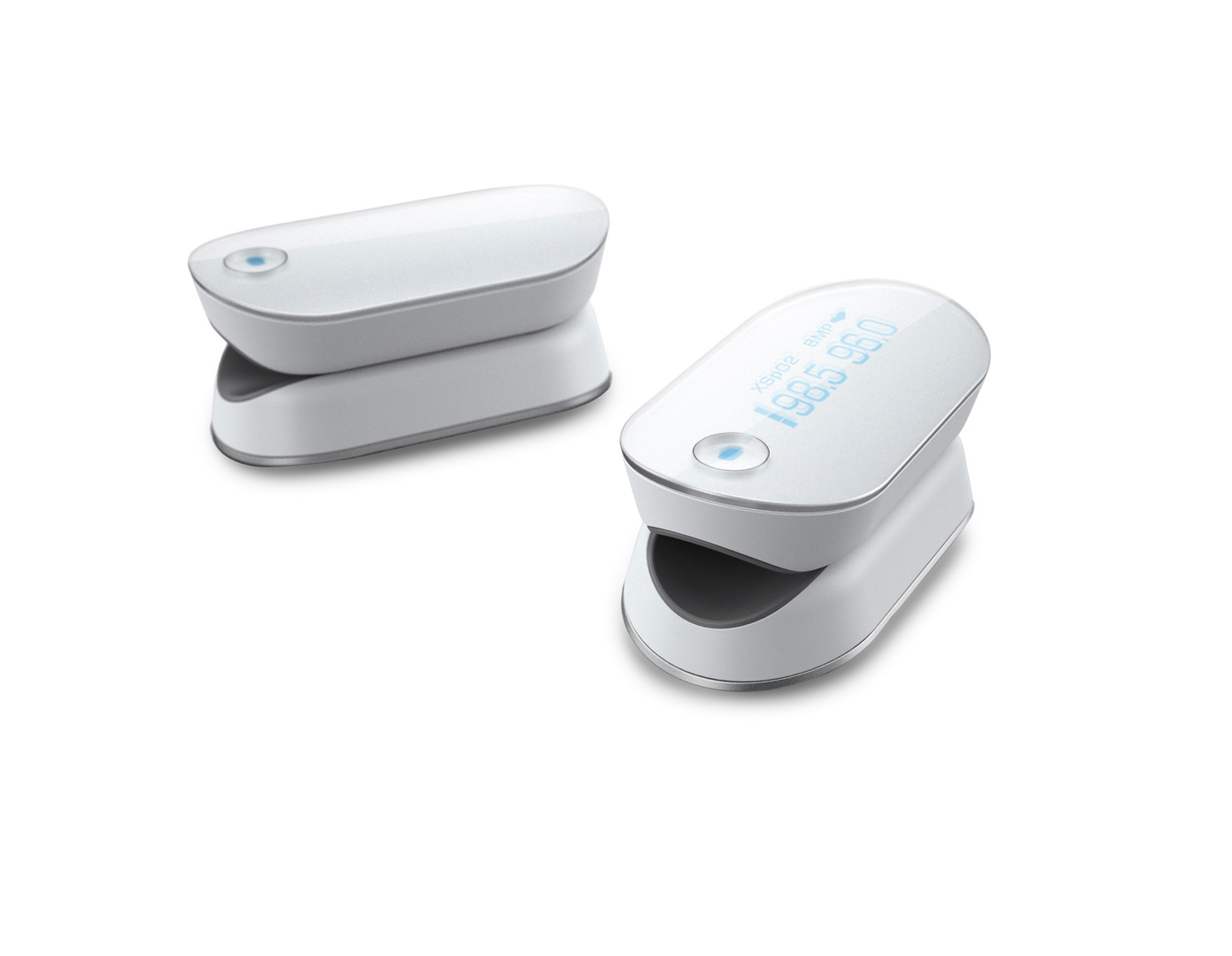 Der Fingerpulsoximeter präsentiert sich in einer puristischen Ästhetik und passt damit zu den Apple-Produkten, mit denen er kompatibel ist.