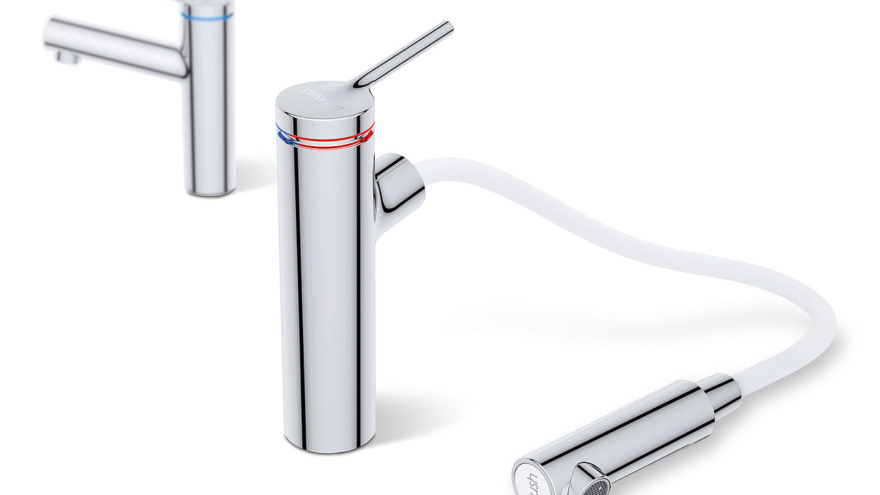Da bei vielen Anwendungen die Regulierung der Durchflussmenge kaum genutzt wird, wurde hier auf diese Möglichkeit verzichtet. Das Gerät funktioniert daher mit nur einer Taste, die den Wasserfluss ein- und ausschaltet. Es kann um zehn Grad nach vorne gedreht werden, damit bequem ein Schlauch angeschlossen werden kann. Beide Bestandteile des Sets sind in Edelstahl gefertigt. Ein weißer und ein schwarzer Regler verbinden sich zu einer optischen Einheit.
