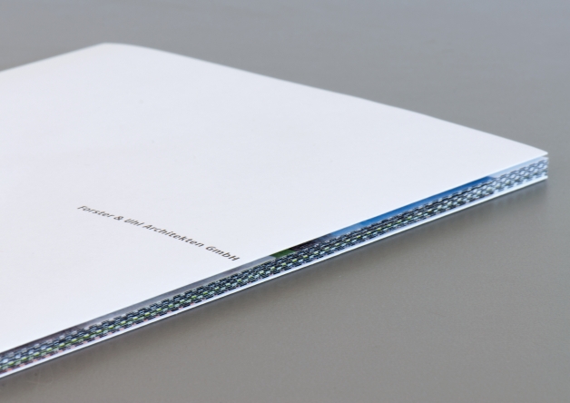 At first glance there seem to be only a few lines inside the brochure of the Forster & Uhl architecture office in Zürich. All pages show large-scale pictures of architec-tural projects realised by the office. Only the last page invites readers to open the perforations of the Japanese binding and take a look at the inner pages of the book. Printed in silver on black Chromolux paper, the drawings, plans and words explain the possible process-oriented methods of the architects.