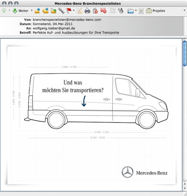 The mailing “Frachtkino” (Freight Cinema) highlights the competence of Mercedes-Benz in the transport sector in a creative way; moreover, it allows the reader to discover the versatile application field of these Mercedes transporters in a proactive way. By scrolling through the e-mail, a wide range of possible goods are “loaded”, from bricks to pork chops. This encourages the target group to perceive Mercedes-Benz as a transportation specialist that can capably answer all transportation-related questions, along the lines of the motto “The right solution for every transport situation”.