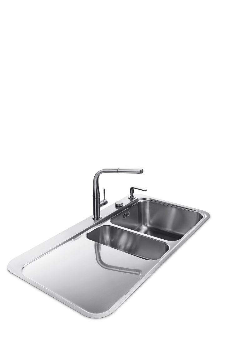 Die Edelstahlspüle Sinos eignet sich für den flächenbündigen Einbau sowie den Einbau von oben. Das Gestaltungskonzept greift den Trend zu organischen Formen auf, mit geschwungenen Konturen entsteht eine zeitgemäße Interpretation des Retro-Stils. Ein weiterer Blickfang ist das Rüstbrett aus antibakteriellem Material, verziert mit einem Ranken-Muster. Das Gesamtbild wird durch eine passende Armatur abgerundet.