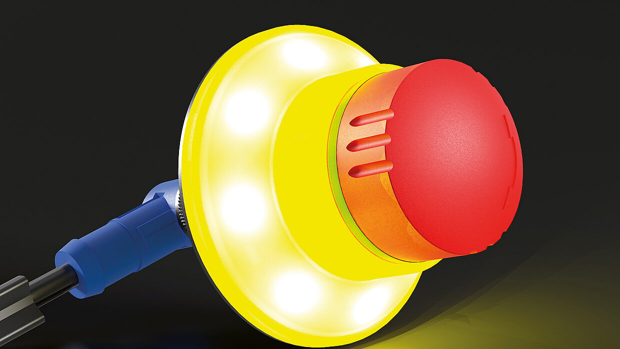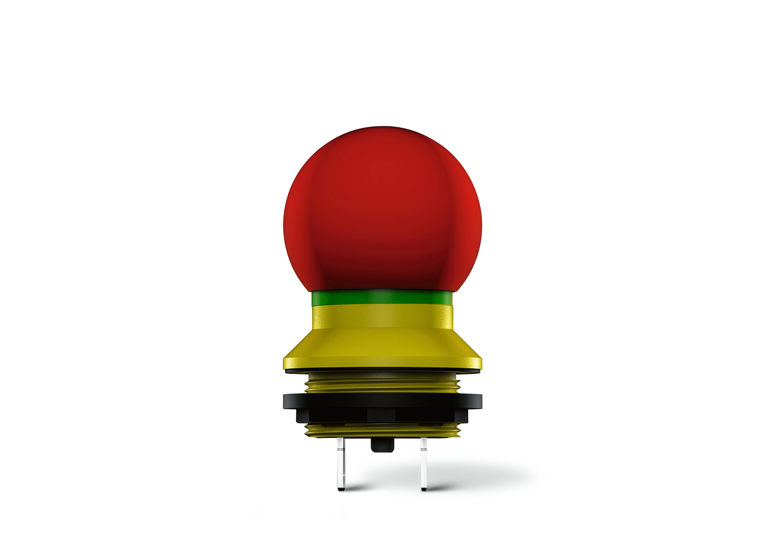 Die avantgardistische Kugelform dieses Nothalteknopfes, der mit einer sehr geringen Einbautiefe gestaltet wurde, ist ästhetisch ebenso überraschend wie zweckdienlich, denn er ist klar sichtbar und augenblicklich als Notstopp erkennbar. Im Notfall wird die Maschine durch ein Ziehen am Kugelkopf sofort abgeschaltet und in einen sicheren Zustand versetzt. Der Kopf weist eine angenehme Haptik auf, die durch ein aufwendiges Erodierverfahren ermöglicht wird, das zudem die Kratzfestigkeit der Oberfläche erhöht.