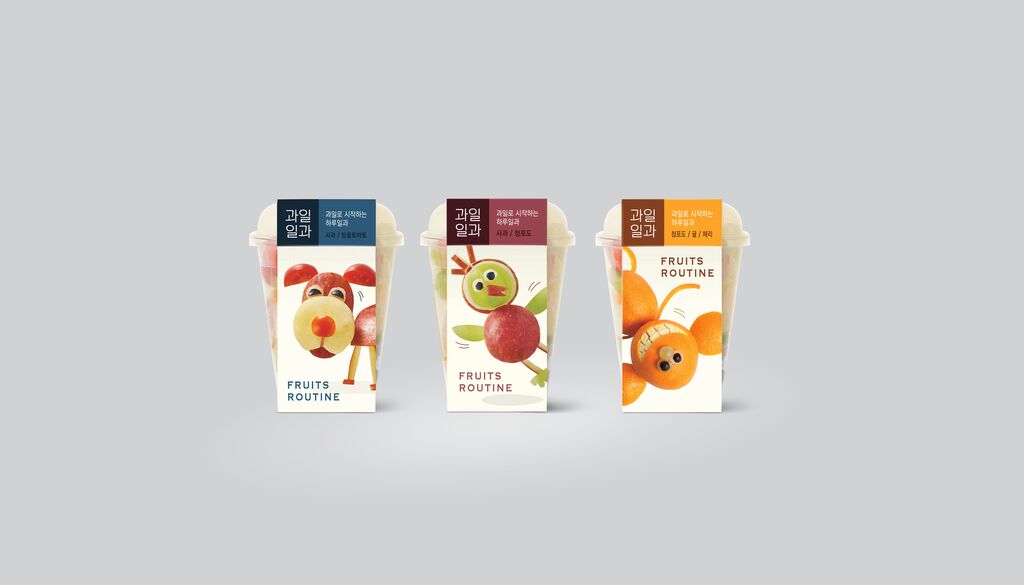 Fruits Routine uses animal shapes to help children develop a healthy routine of eating fruit. The concept showcases the seasonal varieties contained in each product, such as apples or grapes in the shape of puppies or birds. The animal shapes are also meant to spark interest in children who dislike fruit, inviting them to create different animals, as shown in the product pictures. Thus, through this playful activity, children are invited to touch the fruit with their hands, look at the shapes with their eyes and transform them into new forms, exercising their imagination and creativity.
