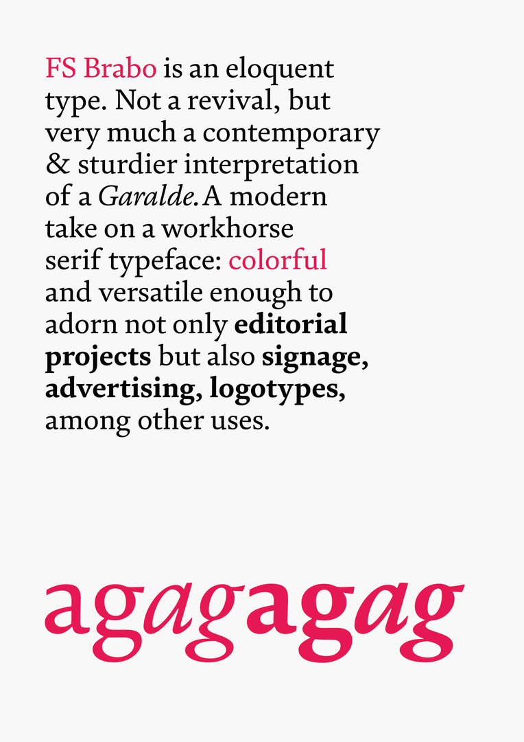 The brief behind FS Brabo was to develop a beautiful, functional serif typeface. As an interpretation of typical Antiqua fonts from the 16th century, the typeface suits numerous applications, such as books, magazines, advertising and corporate word marks. Thanks to its decorative elements, it effectively embellishes and emphasises text components. It benefits from classical balance, but uses chunky serifs and generous counters to create a modern, sturdy yet affable look.