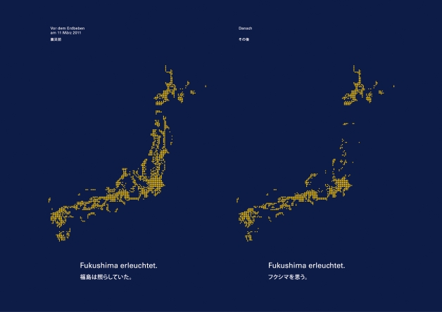 This poster depicts the night-time lighting in Japan before the earthquake on March 11th 2011 in comparison to the situation afterwards. The dark blue of the background can be interpreted as the “night” and the yellow dots as the “light”. Based on the fact that the German word “erleuch­ten” actually means both “illuminate” as well as “inspire”, the poster encourages people to reflect on the circumstances of the nuclear disaster of Fukushima.