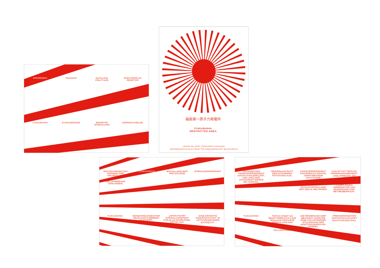 Since the nuclear power plant accident in 2011, the area around Fukushima has been radioactively contaminated. Nevertheless, there are people who are exposing themselves to the radiation, thus suffering permanent damage. These corporate design materials illustrate this problem with a sunburst pattern around a red circle, which is reminiscent of the Japanese flag. At the same time, the pattern resembles the “sunburst” rays on the old Japanese military flag – a symbol of the kamikaze commandos during the Second World War – and thus represents human aggression and self-destruction.