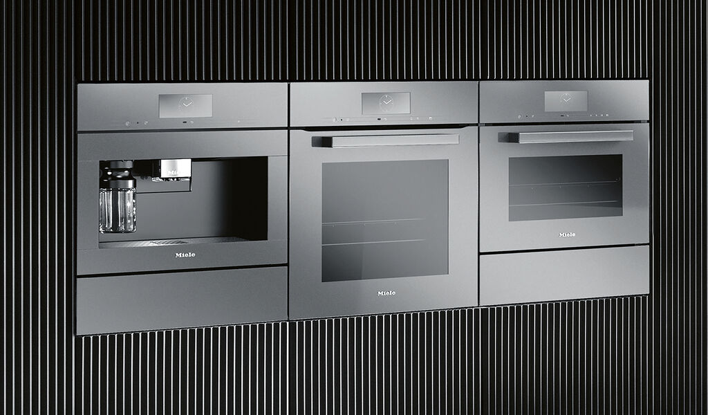 Die Hausgeräteserie VitroLine, die zur Miele Generation7000 gehört, ist durch großflächige Glasfronten geprägt, die in den Glasfarben Obsidianschwarz, Brillantweiß und Graphitgrau hergestellt werden. Die Griffe bestehen aus einem massiven Metallteil, das den Abschluss eines präzise geschliffenen Glaselements bildet, wodurch sie sich harmonisch in die Front des Gerätes einfügen. Die Steuerung erfolgt über ein großes Farbdisplay mit intuitiver Touch-Bedienung oder über eine App.