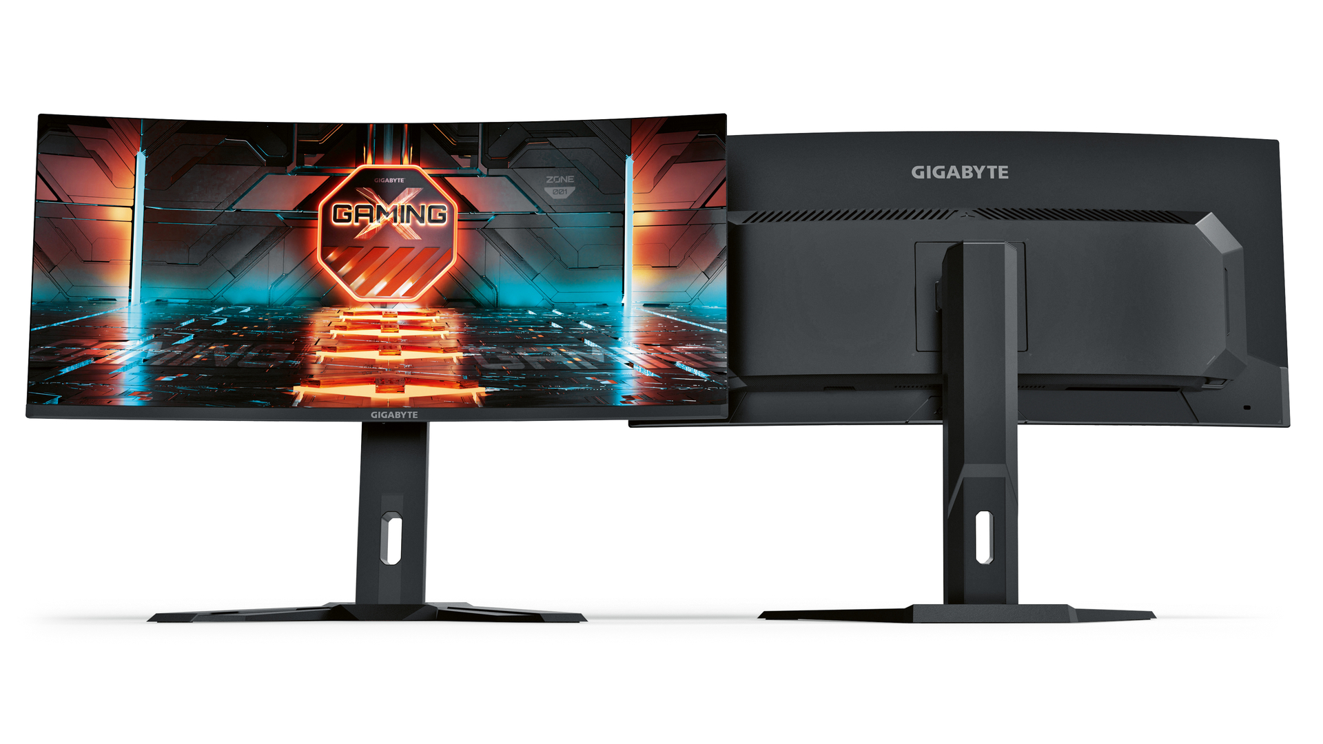 Die Gestaltung des Monitors GIGABYTE MO34WQC2 mit dem leicht gewölbten Bildschirm und dem Standfuß vereint Technologie, Form und Funktionalität.
