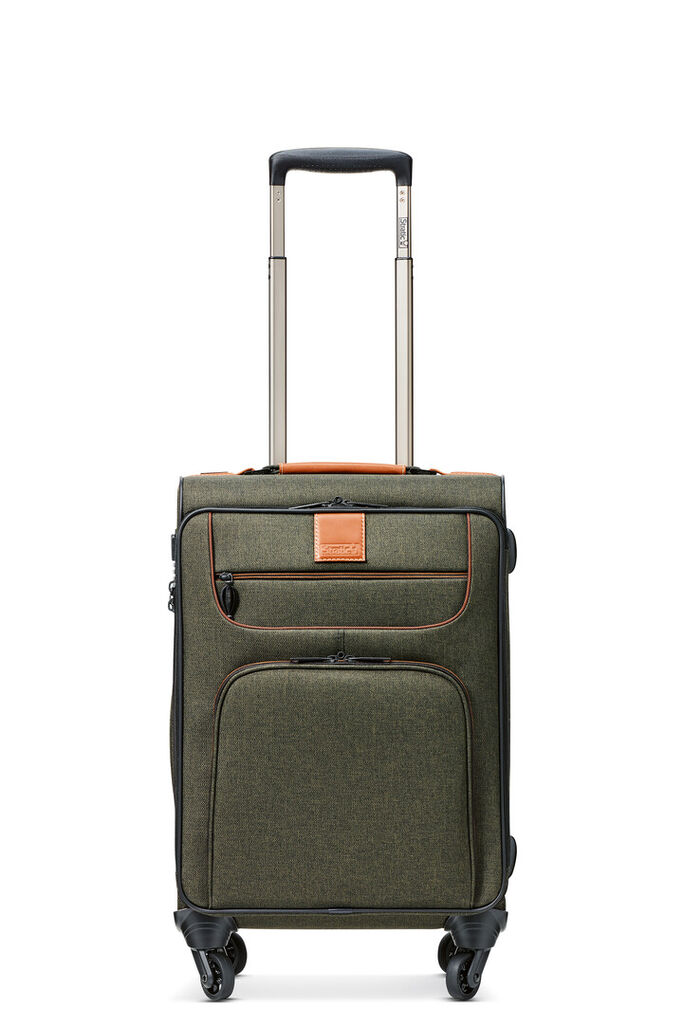Lederelemente in Kombination mit einem weichen Außenmaterial aus recyceltem Polyester zeichnen das Design dieses Koffers aus. In das Kofferschloss-Element ist ein spezieller Schiebeschalter integriert, mit dem zwei der vier Räder blockiert werden können. Das verhindert ein unkontrolliertes Wegrollen des Koffers etwa in einem öffentlichen Verkehrsmittel, ohne dass der Besitzer diesen ständig festhalten oder anderweitig fixieren muss. Der Weichgepäck-Aufbau bietet zwei praktische kleinere Vordertaschen und ermöglicht den direkten Zugriff auf ein Laptopfach in einer großen Vor-tasche.