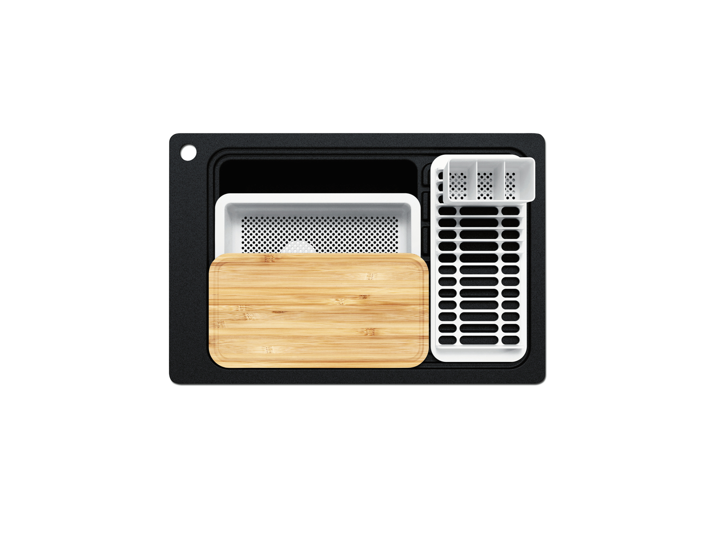 Die Küchenspüle GoodHome Romesco bietet Multifunktionalität in einem kompakten Format. Integriertes Zubehör ermöglicht es, dass wichtige Schritte bei der Zubereitung von Speisen wie das Waschen, Trocknen oder Schneiden von Lebensmitteln platzsparend innerhalb der Spüle stattfinden können. Das stapelbare Zubehör wird vertikal oder horizontal in der Spüle ausgerichtet und bietet somit ein anpassungsfähiges System für einen individuellen Arbeitsablauf.