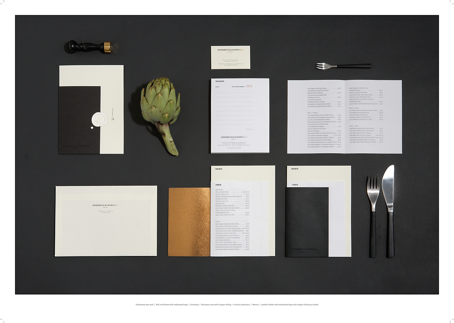 Grønbech & Churchill is a gourmet restaurant in Copenhagen. Their corporate identity is inspired by culinary craftsmanship, which is expressed throughout the identity by juxtaposing contrasting letter forms, colours and textures. The result is a modular solution that allows the restaurant to flexibly print their menus in-house. To lend the desktop prints a nevertheless elegant visual appearance, a special translucent paper was selected for the menus. The printed material combines black-and-white with copper.
