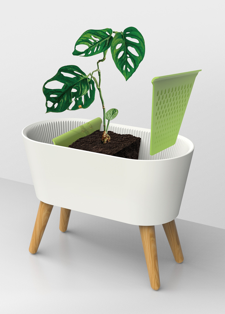 The inner surface of the cavity of the Growing-Pot is designed as a continuous groove, and the volume of the flower pot can be adjusted using two baffles to meet the space requirements of plants at various stages of growth. The baffle’s inverted cone shape makes extraction and insertion simple. The baffle’s surface is debossed with raindrop shapes, and the middle-to-lower section is perforated with drainage holes to allow excess water to drain. It also keeps moisture in if the user is not at home.