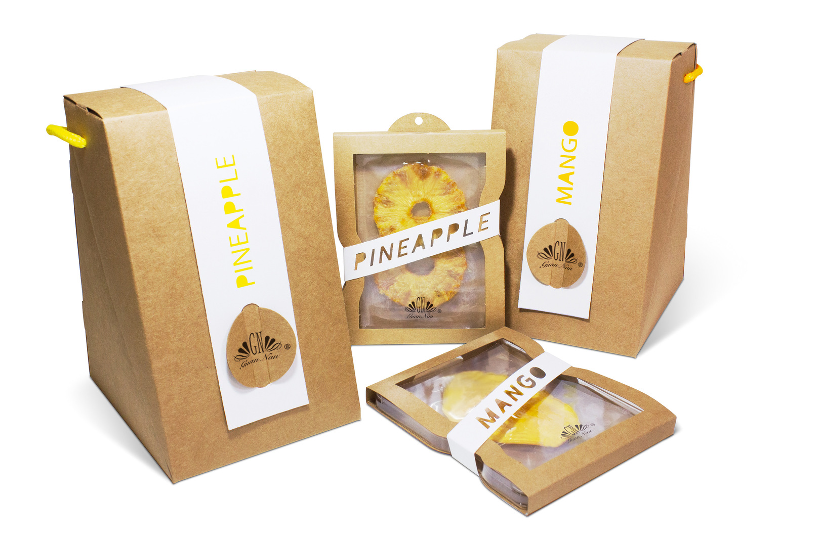 Guan Nan is a Taiwanese fruit processing company that produces high-quality dried mango and pineapple. The new packaging design consists of a single-serve fruit package and a gift box that contains six of these individual fruit packages. The aim of the design is to show the freshness of the fruit by displaying the product as much as possible. As a contrast to the golden yellow colours of the fruit, the natural brown cardboard enhances the feeling of the product’s natural origins. To highlight each product name, the white band across both the single fruit package and the gift box with letter cut-outs allows the fruits themselves to give colour to their names on the packages.