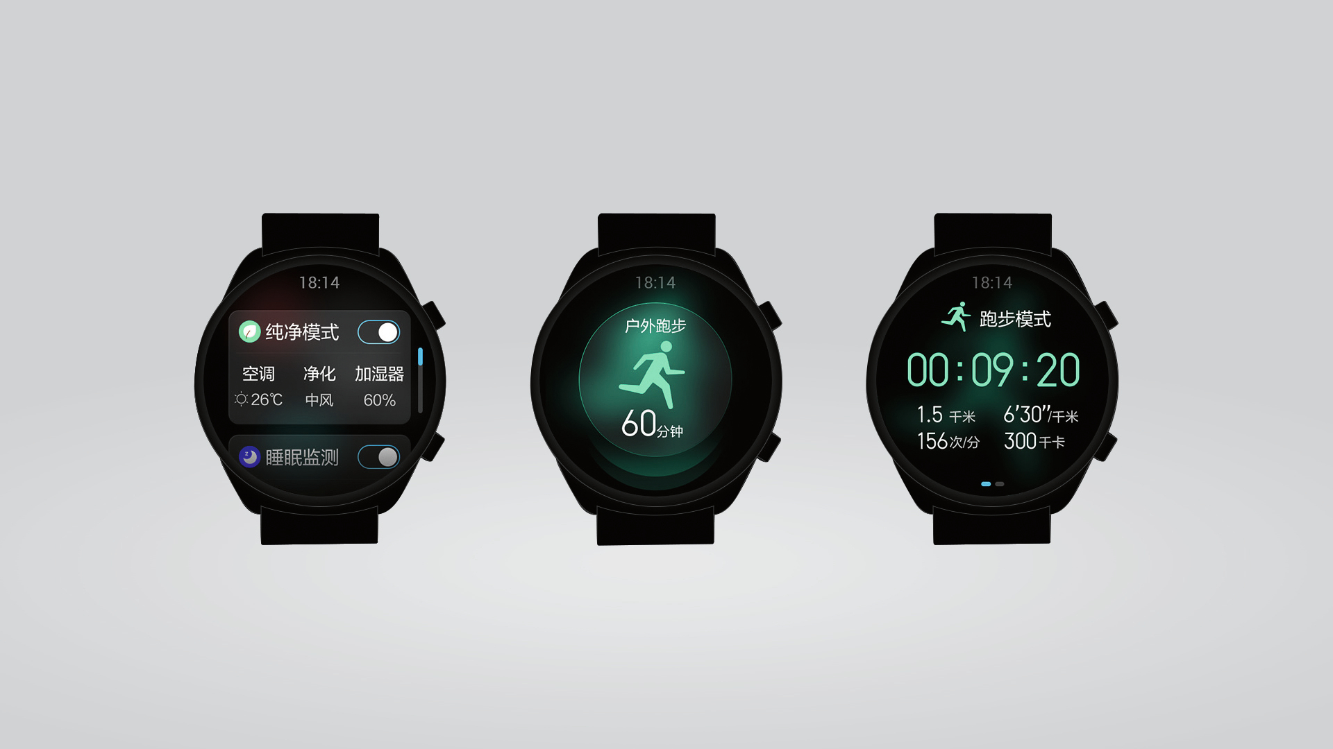 The Haier EverFit smartwatch features a watch face with two functional layers. The first layer displays information such as the time and date, while users can customise the second layer according to their preferences and add relevant information as cards. Upon tapping the dial, the view switches from the first to the second layer to display the individual information. The smartwatch supports a variety of gestures and also provides feedback via vibration. Household appliances can be controlled and operated via the smart home app using NFC.