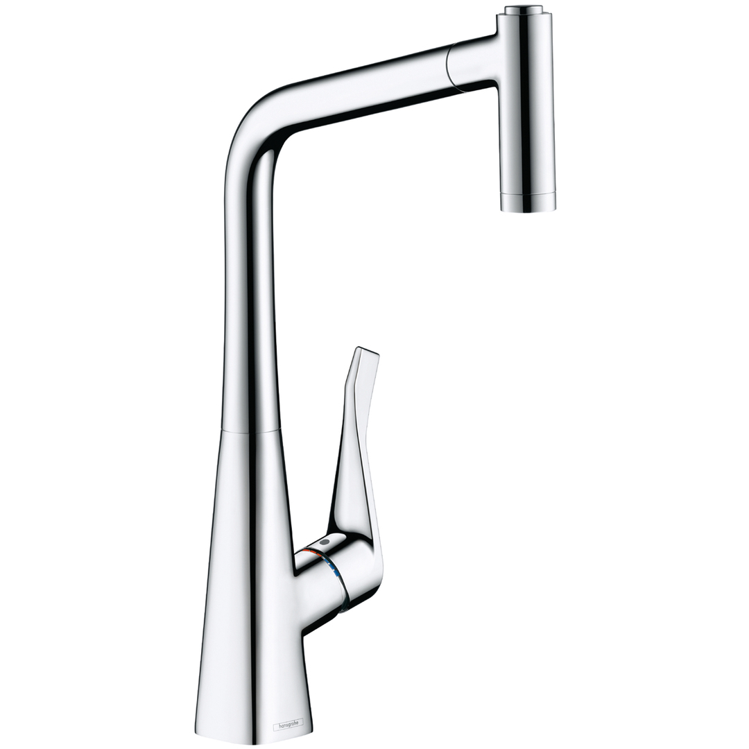 Die Armatur Metris spiegelt mit ihrem viereckigen Sockel die Form vieler Spülbecken wider und trägt damit zu einem stimmigen Gesamtbild des Spülbereichs bei. Eine mit einer Magnethalterung am Armaturenauslauf befestigte Handbrause lässt sich ergonomisch von vorne greifen und ausziehen. Sie ermöglicht flexibles Arbeiten mit zwei Strahlarten. Die Armatur lässt sich über einen flächigen Griff komfortabel bedienen – notfalls sogar mit dem Ellenbogen.