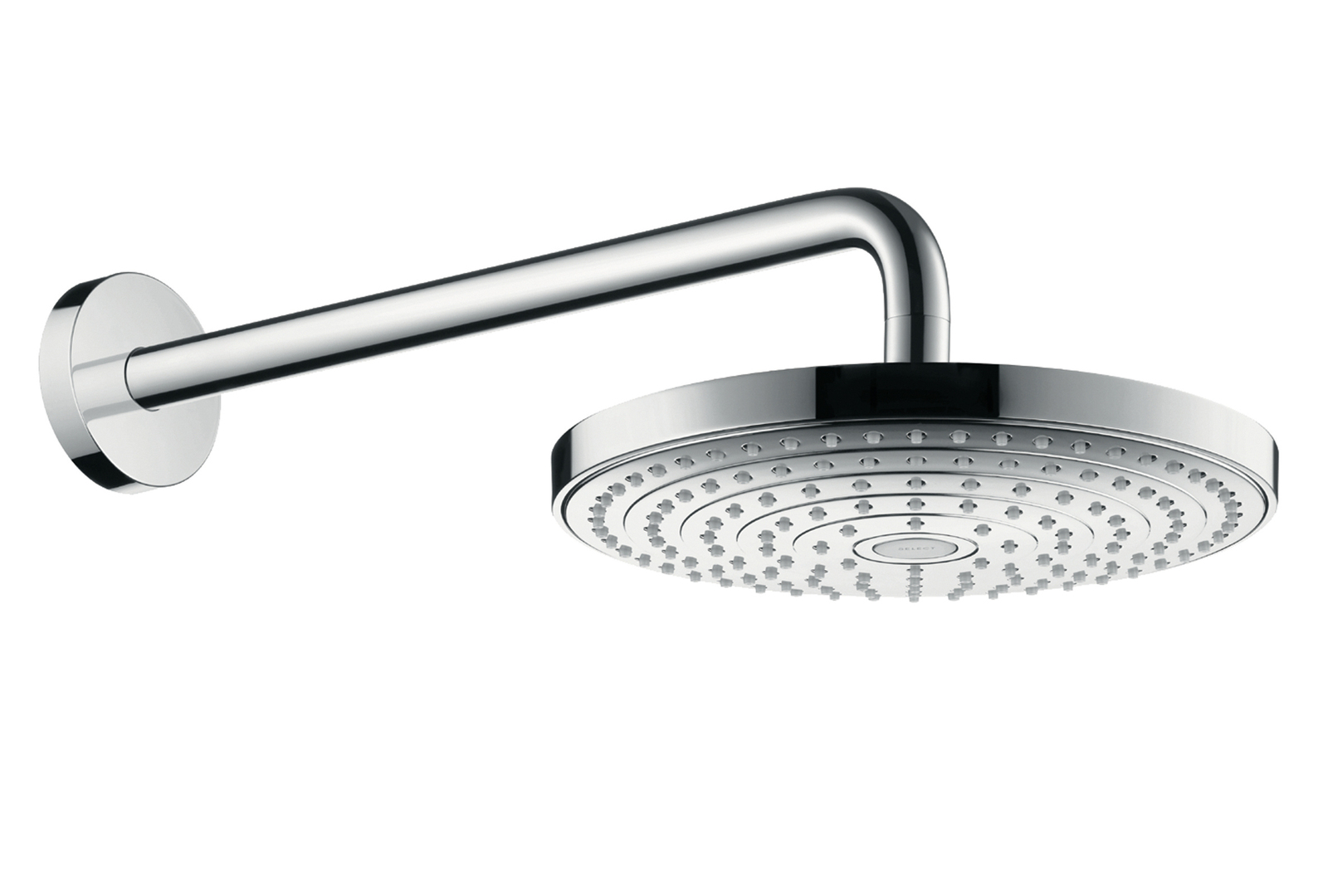 Die Kopfbrause Hansgrohe Raindance Select S 240 verteilt zwei Strahlarten über ihre gesamte Fläche: einen kräftigen Rain-Strahl zum Ausspülen des Shampoos und einen mit Luft angereicherten RainAir-Strahl. Der Strahlwechsel erfolgt per einfachem Klick auf den Select-Knopf in der Mitte der Strahlscheibe, die zur leichten Reinigung komplett abnehmbar ist. Die Kopfbrause ist als Wand- und Deckenversion erhältlich. Neben der reinen Chrom-Oberfläche gibt es auch den zweifarbigen Weiß-Chrom-Look.