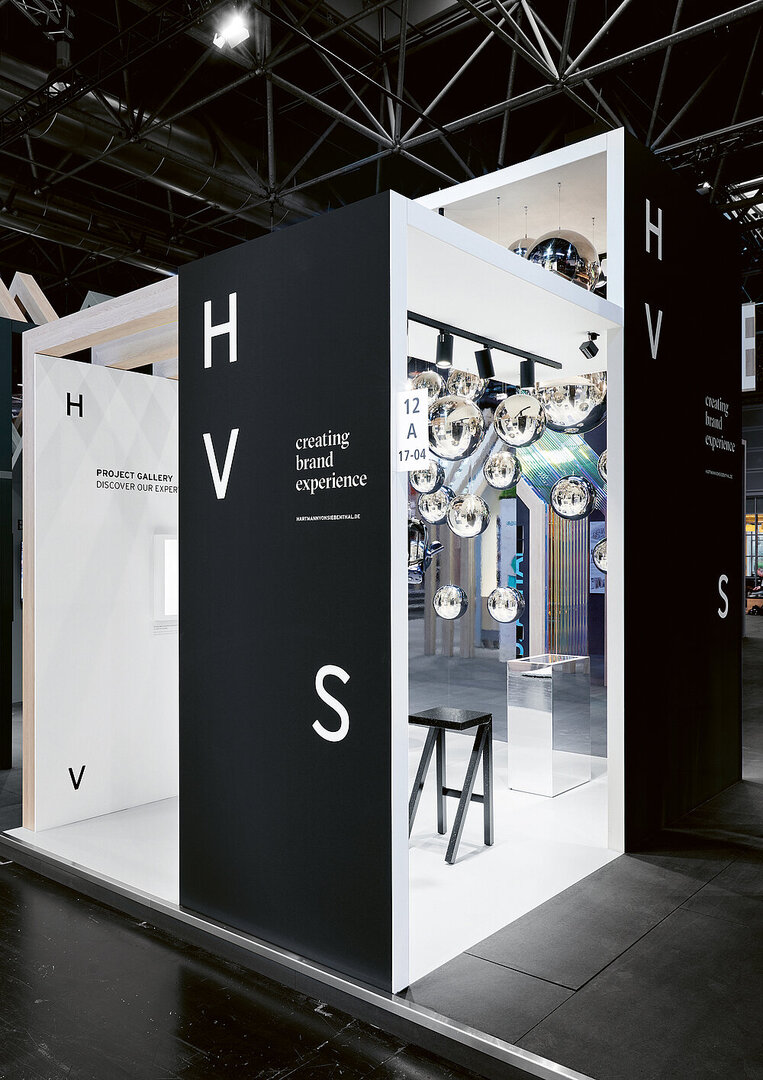 This trade-fair booth combined three rooms into an immersive showcase that aimed to activate visitors and guide them step by step through the brand’s world. Visitors entered the reflective reception area through an attention-grabbing portal with silver steel spheres. Transparent business cards acted as a key that brought the seemingly white screens of the gallery to life. A glance through the card revealed the company portfolio. In addition, the “Modular Individual XR” virtual showroom invited visitors to create individual prototypes.