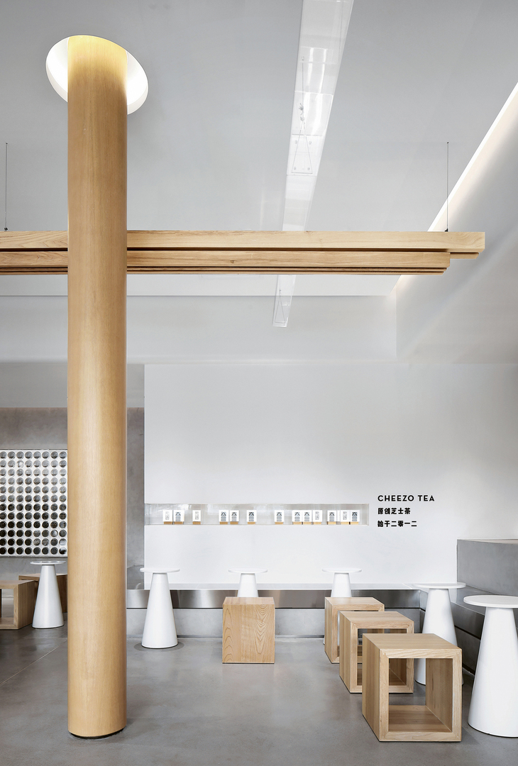 This branch of the HEYTEA teahouse chain in Foshan, China, sets the “unity of Zen and martial arts” as the basic theme for its design. The challenge was to complement the brand image with visual references to the cultural heritage of the region. The town of Foshan is famous for Wing Chung, a traditional kung fu form. The vertical and horizontal wooden beams in the centre of the room are inspired by the wooden dummy used as a Wing Chung training tool. The images of dancing lions and vessels point to the local Lingnan culture, while the hilly cloud landscape in a glass table refers to the mountainous origin of the tea.