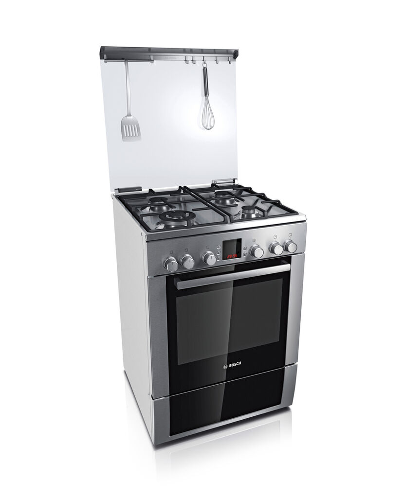 Das Erscheinungsbild dieses Gas-Standherds ist durch die Kombination von Edelstahl und Glas geprägt. Auf der Stirnseite betont der großflächige Einsatz von Glas den besonders großen Backofen. Das Material wird auch auf dem Kochfeld und als Abdeckung bzw. Spritzschutz eingesetzt und ermöglicht eine leichte Reinigung. Spülmaschinengeeignete Gusstopfträger und ein Vollmetallgriff unterstreichen die Wertigkeit dieses Gerätes.