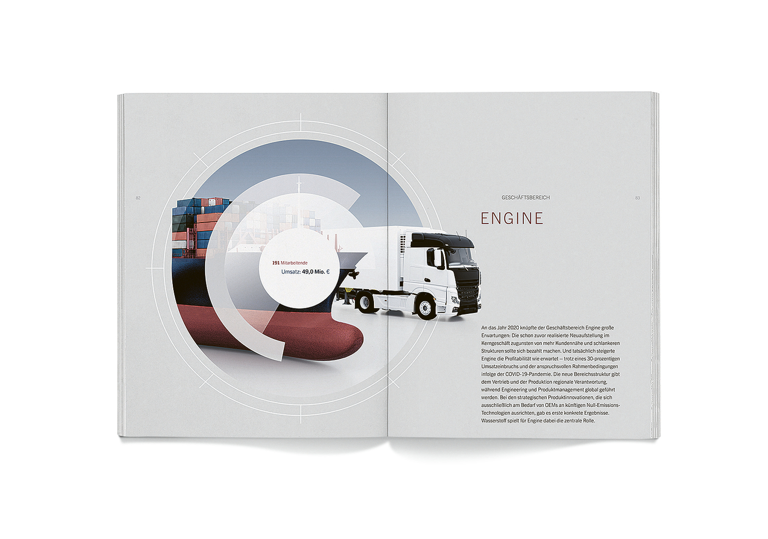 The Hoerbiger Yearbook 20/21 is intended to be more than an annual report. It aims to provide partners and friends as well as employees with comprehensive information about the previous year. Each business division is presented with an individually illustrated opening page for that chapter. Technical elements such as scales and dynamic circular shapes are illustrated in a collage-like manner. The visual language is taken up in abstract form on the cover by means of relief embossing and die-cutting. The overall appearance of the book corresponds to the company’s understatement and relies on the effect of balanced typography and generous white space.