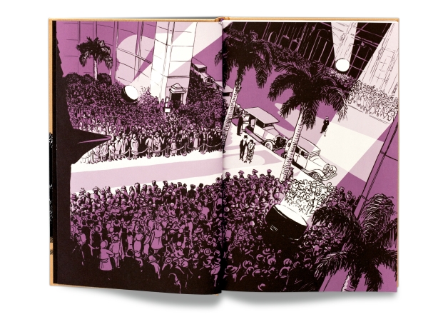 Illustration, typography and design are merged into one graphic unit in this book about film. Cinematic elements, such as titles and credits, end title credits, zoom shots and narrative image sequences, are rendered into the medium of a book. Scenes done in bright Technicolor recount the story of the breakthrough of colour film. The graphic style, the choice of typeface and fonts used in the titles are inspired by old film posters of the 1930s. A golden, screen printed linen hardcover is supposed to underline the glamour of this defining era of film history.