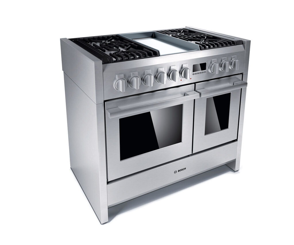 Dieser formal und funktional ausdrucksvolle Range Cooker wurde für die semiprofessionelle Küche entwickelt. Seine elegante, schlichte Formensprache steht in einer visuell reizvollen Verbindung mit einer prägnanten Wertigkeit. Eine gehobene Ausstattung erlaubt die komfortable Zubereitung diverser Gerichte, unabhängig davon, ob es sich dabei um ein asiatisches Wokgericht, ein Hühnchen vom Drehspieß oder Fisch vom Grill handelt. Dieser Standherd wurde in seinen großzügigen Proportionen als prägnanter Mittelpunkt der Küche konzipiert. Der konsequente Einsatz hochwertigster Materialien unterstreicht ein eigenständiges Gesamtbild. Demzufolge sind sowohl die Schaltergriffe als auch die Türgriffe samt ihrer Anbindung aus Metall gefertigt. Im Kontrast dazu sind die geometrisch ausgestalteten Topfträger aus Gusseisen, während der Grill aus Edelstahl gefertigt wurde. An der vorderen Gerätefront dominiert die Bedienleiste mit ihren schlichten Drehknöpfen in Kombination mit den beiden symmetrisch angeordneten Backofentüren.