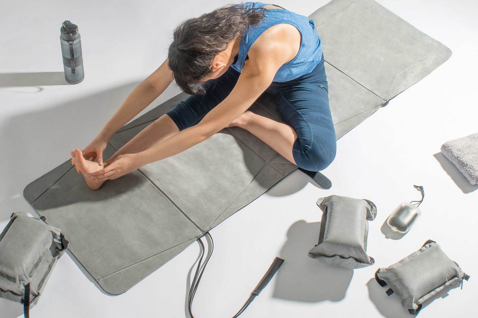 HyperMat is an innovative workout product that eliminates all limitations to working out. It serves as a set-up for various types of workouts that can be carried out in any setting. HyperMat folds into a stylish sports bag for convenience and portability, allowing it to accommodate more items than just the HyperMat accessories to meet all of the user's workout needs. An inflated HyperMat creates an unstable surface, which aids in the training of the user's stability and core strength, and increases the intensity of freehand training. Turning the knob on the yoga bricks will automatically inflate them. They can also be stacked to create different heights to assist a workout. The charm on the strap is a training equipment hand pump that can be used to pump extra air to increase workout strength. Red Dot Award: Design Concept | Concept | Sports and Recreation