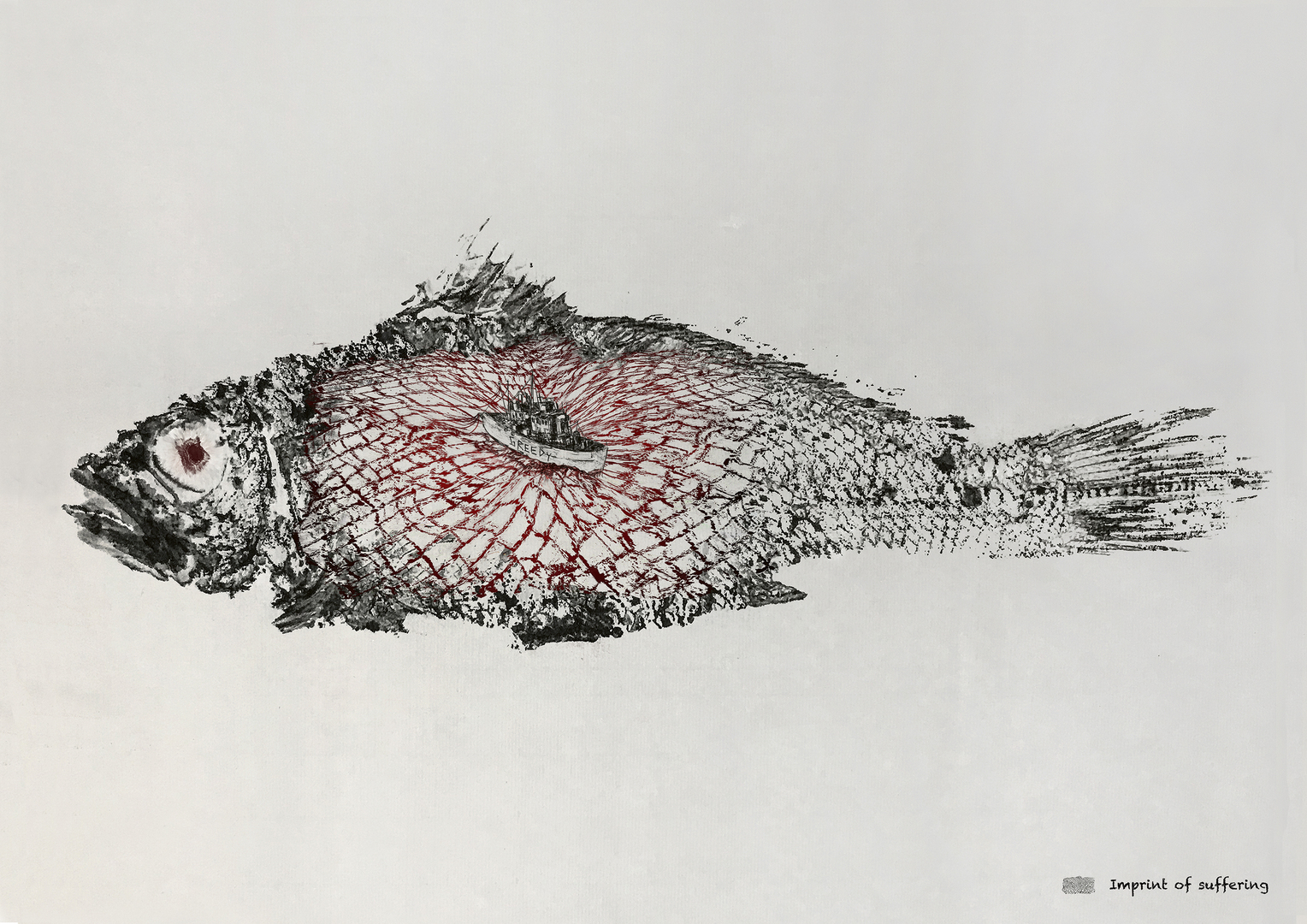 Considering that fishing efforts have recently pushed many fish populations to the edge of extinction, these illustrations send a message of awareness. A dark spot stands out in the middle of the poster which looks like an ordinary fish print at first sight. However, the spot turns out to be a trawler, covering the whole body with a fishing net. To further accentuate the damage caused by overexploitation, the close- up in the second picture gives the impression that the fishing net has spread over the entire ocean.