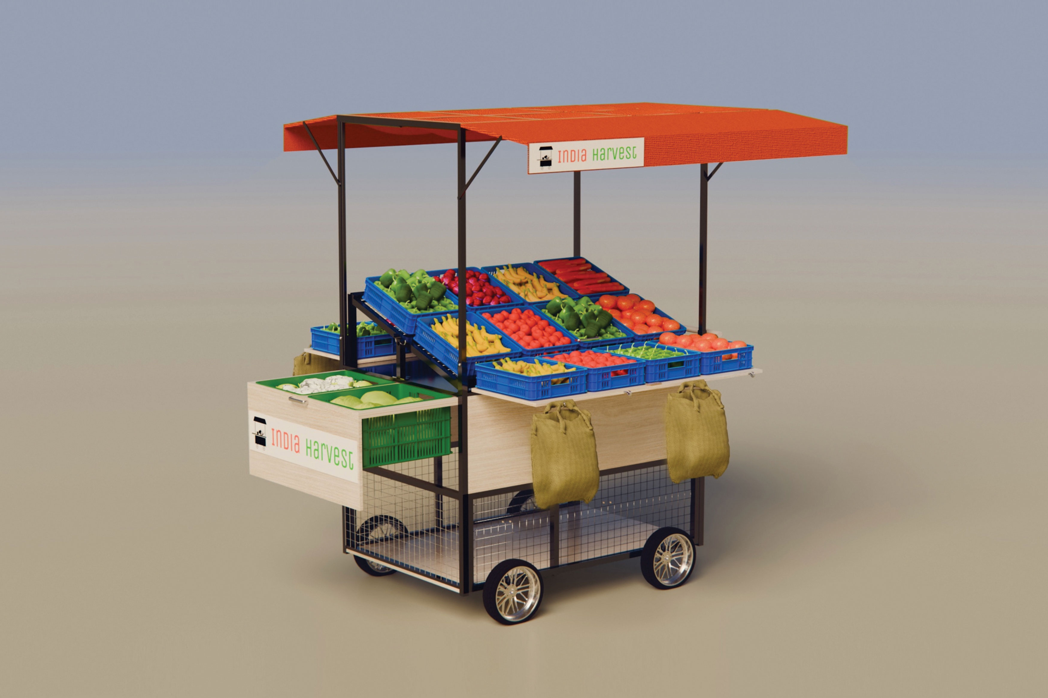 India Harvest addresses critical challenges for street vendors, improving their work conditions and customer experience. Featuring expandable shelters, water sprinklers to preserve produce, and triple storage capacity, it enhances vendors’ operations. Customisable displays and jute bags streamline shopping while promoting sustainability, and using locally available materials fosters community engagement and cost-effectiveness. India Harvest blends tradition with modernity to revolutionise India's street vending.