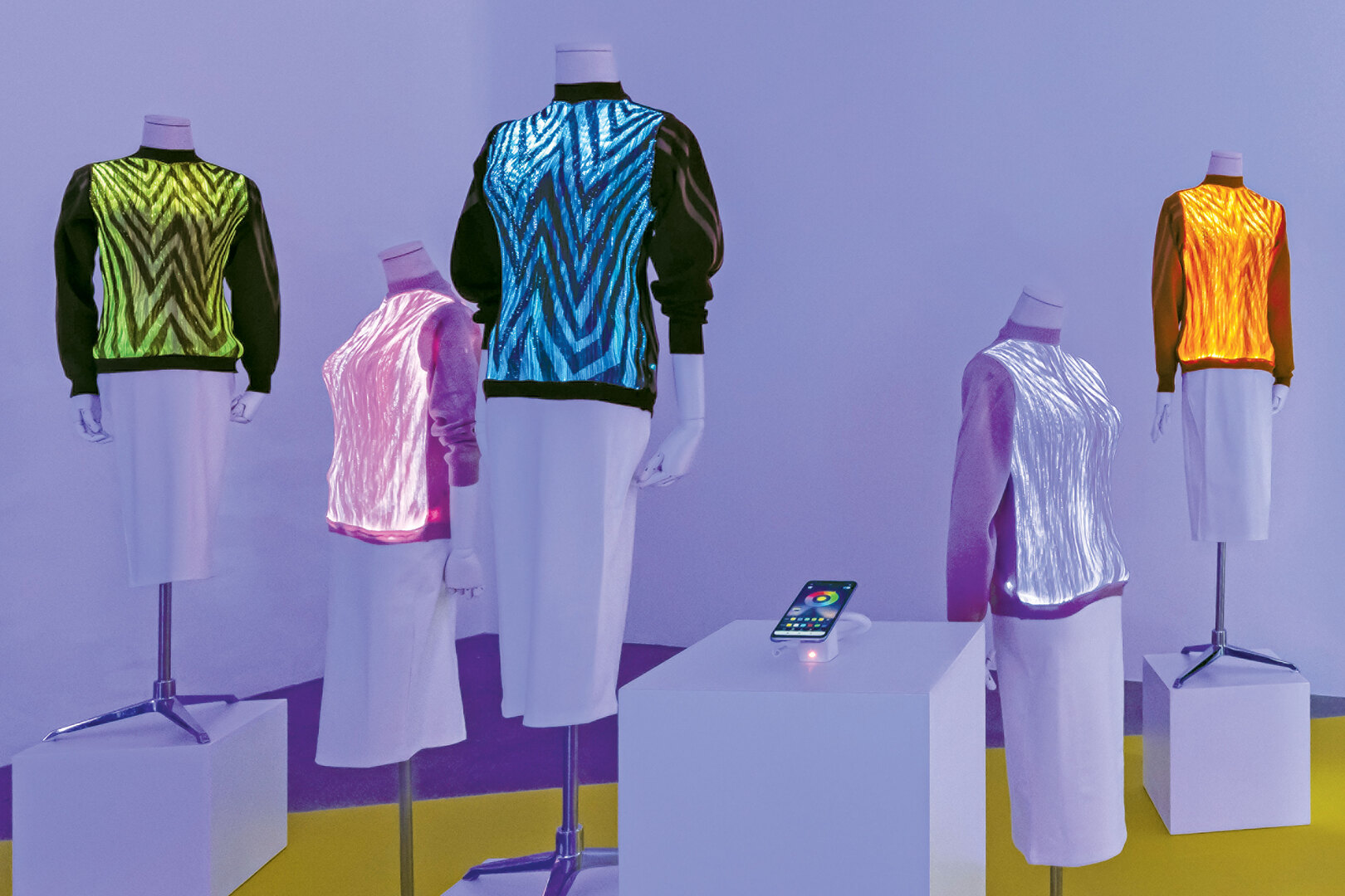 Interactive technology transforms conventionally passive garments into customisable fashion with colour illumination that adapts to the needs of the wearer. The immediate adaptability of Interactive Illuminative Knitwear enables fashion consumers to intuitively change the colour of their outfits based on their preferences and needs, extending the garment’s longevity and reducing the need to purchase multiple outfits for colour matching needs.
