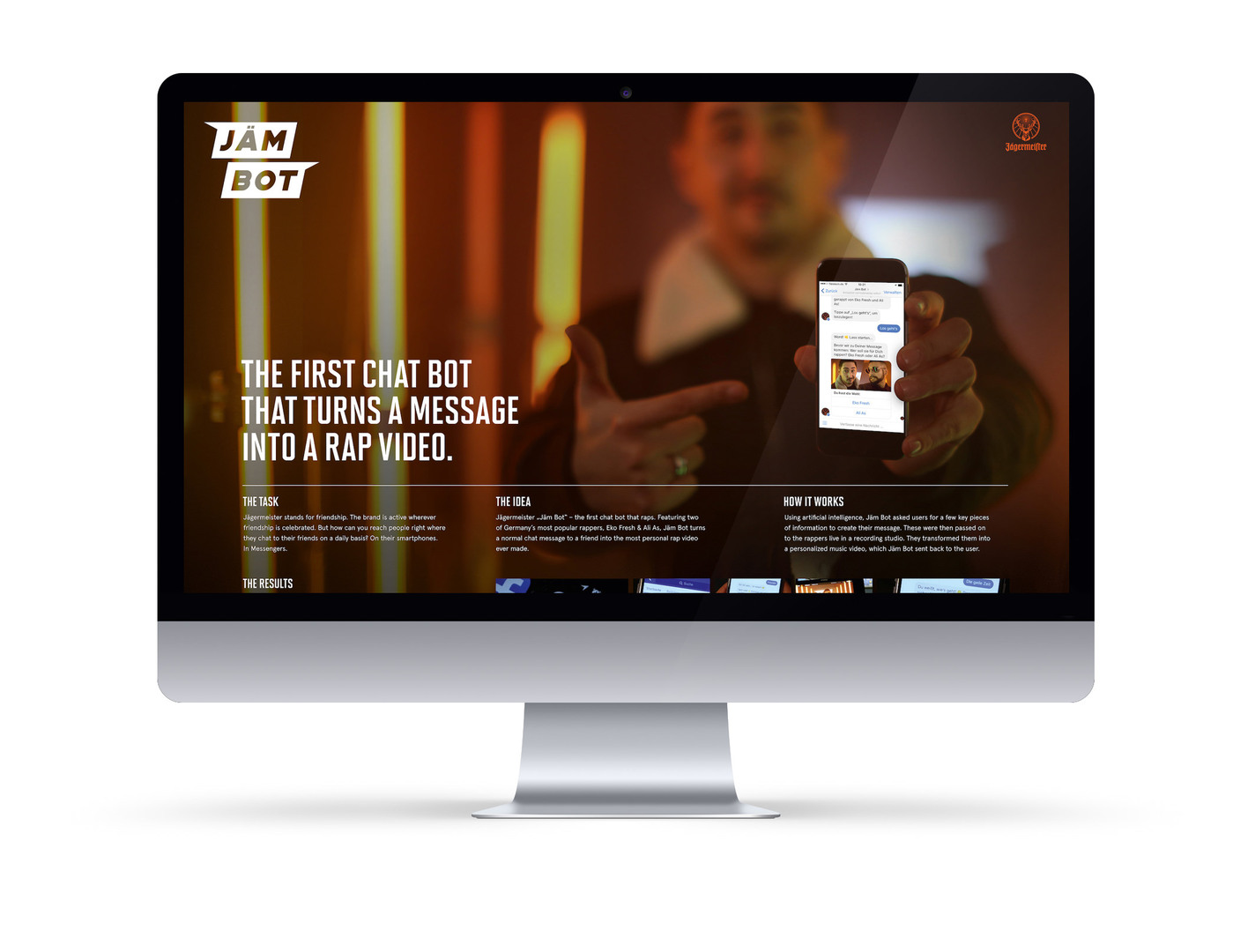 The Jäm Bot by Jägermeister is a chatbot that turns text messages via the Facebook Messenger into a personalised rap video. Using artificial intelligence technology, the chatbot asks users for a few key pieces of information to create their message. On the release day, 6 December 2016, the messages were passed on to two of Germany’s most popular rappers, Eko Fresh and Ali As, live in a recording studio. They transformed them into a personalised music video. Since that day, the chatbot works fully-automatic without live-rappers.