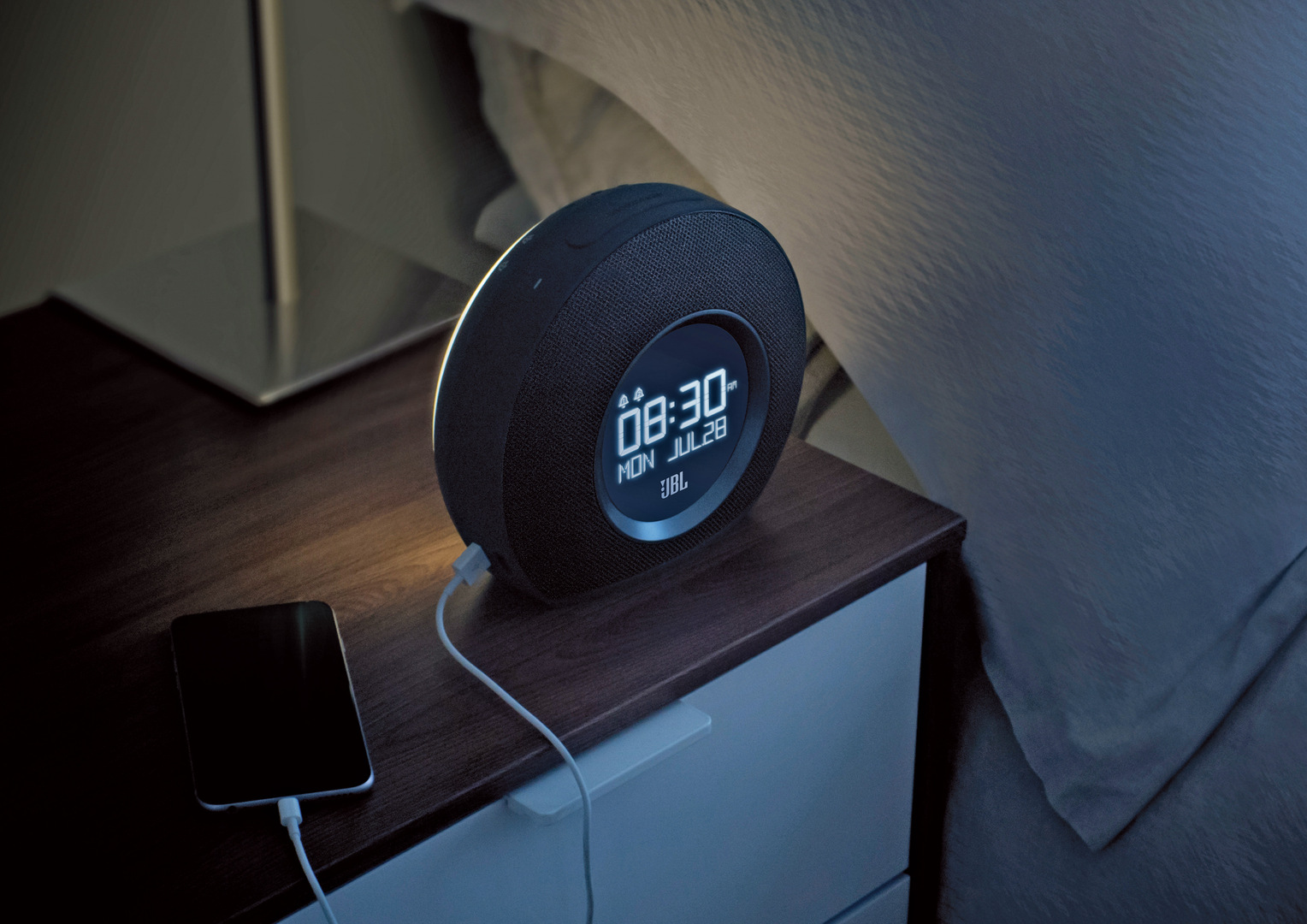 The interface of the JBL Horizon alarm clock allows for subtle wake-up experiences based on individual preferences. A gradual warm light starts the awakening process gently, ten seconds before the alarm rings. The alarm sound can be chosen from various wake-up sounds, radio stations or music stored on the smartphone. A built-in light sensor adjusts the display brightness according to the surrounding light level. A sleep mode, which automatically turns off the music after a certain time, and a snooze button both enhance user convenience.