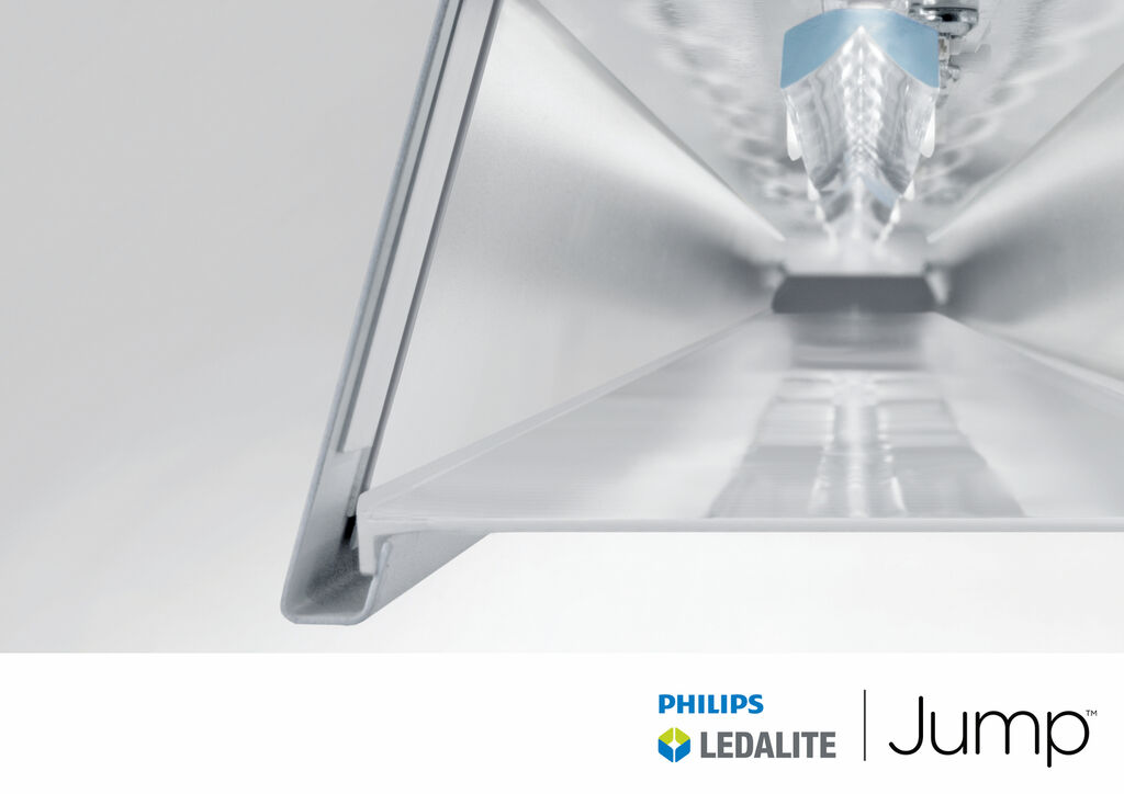Jump ist eine direkt strahlende Hochleistungs-Leuchte für LED- oder Fluoreszenz-Leuchtmittel. Ihre Kombination aus architektonischen Elementen, integrierter Technologie und patentierter Optik zeichnet sich durch höchste Energieeffizienz, ein End-to-End-Kontinuum der Luminanz und eine überlegene Lichtqualität aus. Das besondere Kennzeichen ihrer zeitgemäßen Form ist jedoch die außergewöhnliche, leuchtende Endkappe. Die holographische Nanotechnologie MesoOptics von Philips Ledalite ist ebenfalls in Jump integriert. MesoOptics homogenisiert das Licht und die Farbe, um die Konsistenz sicherzustellen, während zugleich ein hoher Blendwinkel gewährleistet wird, um eine optimale Batwing-Lichtverteilung zu erhalten. Verfügbar in einer Vielzahl von unterschiedlichsten Leuchmitteln, Formen, Farben und Montagemöglichkeiten, bietet Jump eine einfache „Plug & Play“-Installation, welche die Wartung und Aufrüstung erleichtert. Die Jump-LED-Variante hat eine Lebenserwartung von 60.000 Stunden bis L80 mit fünfjähriger Garantie auf das gesamte Beleuchtungssystem.