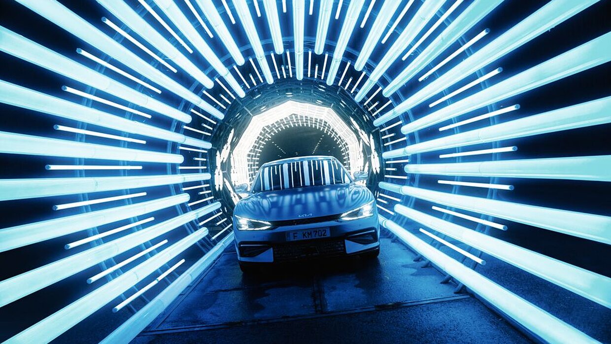 Der EV6 ist das erste dedizierte Elektrofahrzeug von Kia und weist bereits viele Elemente auf, die die Neuausrichtung der Marke hin zu einem Anbieter nachhaltiger Mobilität prägen sollen. So repräsentiert er unter anderem die neue visuelle Identität der Fahrzeuge, die von der Designphilosophie „Opposites United“, der Verbindung von Gegensätzen, bestimmt ist. Sie zeigt sich beispielsweise in den kontrastreichen Kombinationen von scharf gezeichneten Stilelementen und plastischen Formen. Der EV6 basiert auf der neu entwickelten Elektroplattform E-GMP, die das Platzangebot im Fahrzeuginneren vergrößert, sodass der EV6 auch dank des flachen Bodens viel Beinfreiheit und Stauraum bietet. Das Interieur-Design verbindet Platz, Komfort und die Verwendung nachhaltiger Materialien mit einer Hightech-Anmutung, die von dem markanten gewölbten Panoramadisplay geprägt wird, und stellt auf diese Weise eine emotionale Verbindung zwischen dem Menschen und der ihn umgebenden Technik her. Das prägnante Außendesign kombiniert kurze Überhänge und einen langen Radstand mit kräftigen Proportionen und geht auf die Typologie des EV6 als Crossover zurück. In Verbindung mit einem sehr schlanken Seitenprofil, einer besonders niedrigen Frontpartie sowie einer vorwärts gerichteten Architektur mit einem hohen Heckspoiler mit integrierten Rückleuchten verleiht dies dem EV6 seinen hohen Wiedererkennungswert. Die Front ist durch ein elegantes, zeitgemäß gestaltetes Tagfahrlicht geprägt, das das markentypische „Tigergesicht“ in die Elektro-Ära überführt.