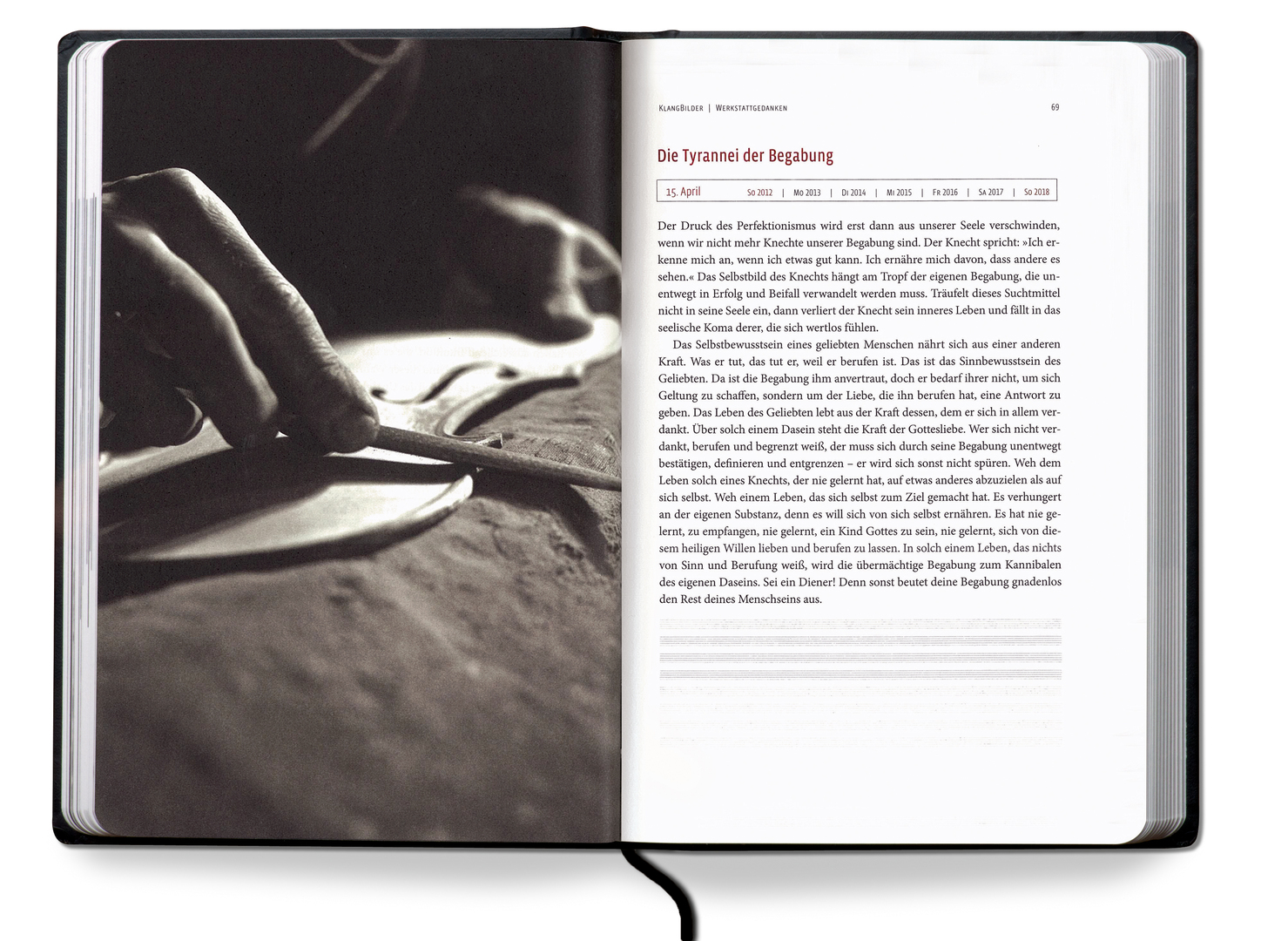 Due to the look and feel of its cover as well as its bookmark ribbon, the calendar/diary by the name of KlangBilder (Sound Pictures) looks like a conventional notebook at first glance. In the inside, the seven-year calendar connects images of a master violin-maker with space for the user’s thoughts and notes. The texts are supplemented by 52 black-and-white photographs that capture, with great attention to detail, the construction of a violin in the workshop, but also the author’s art of living and passion.