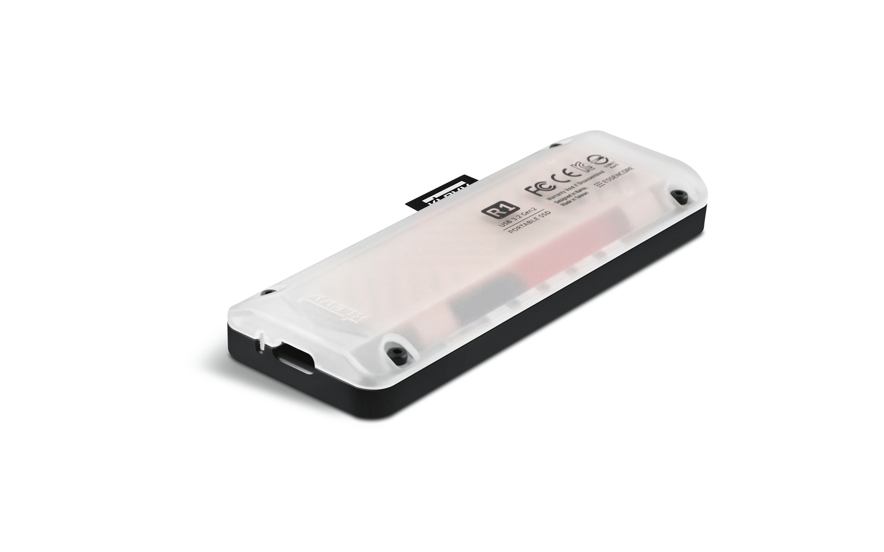 Die tragbare SSD KLEVV R1 liefert eine Lese-/Schreibgeschwindigkeit von bis zu 1.000 MB/s und unterstützt Windows-, MacOS- und Android-Systeme, die per USB-C angeschlossen werden. Sie bietet 500 GB oder 1 TB an Speicherkapazität und ist geprägt von einer Doppelstruktur mit minimalistischer schwarzer Oberseite und einer transparenten Unterseite, die das Innere durchscheinen lässt. Mit ihrem länglichen Format lässt sich die SSD gut in der Hand halten und leicht verstauen.