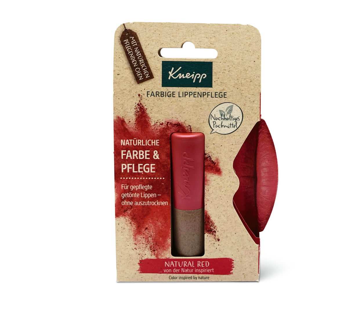 Bei der Konzeption der Verpackung für die Lippenpflege Kneipp natural care & color standen nachhaltige Ziele im Vordergrund, die mit einer angenehmen Haptik und auffälligen Ästhetik in Einklang gebracht wurden. Das Material der Faltschachtel weist einen 25-prozentigen Anteil Gras auf; für die Hülse kamen Kork sowie weitere organische Bestandteile zum Einsatz. Die Formgebung sorgt durch eine ausgestanzte Lippe im stark besetzten Handelssegment für optischen Raumgewinn.