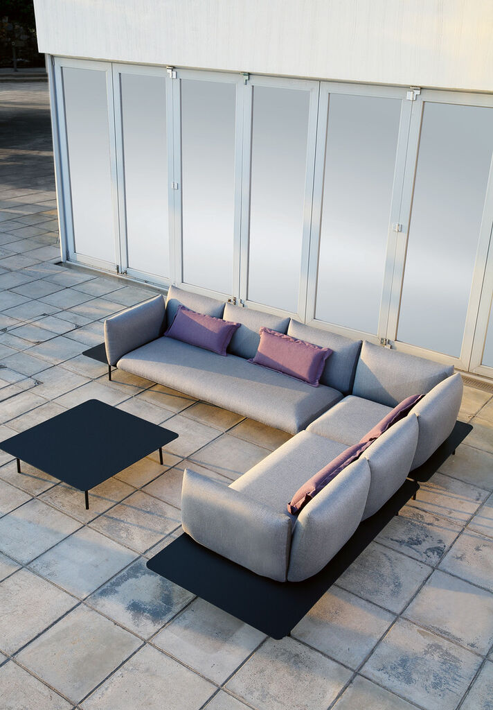 Der Kontrast zwischen schwarz eloxiertem Metall und weichen Stoffpolstern prägt die Ästhetik dieser Loungemöbel. Deren tiefe Sitzposition folgt einer orientalischen Produktphilosophie, die Balance und Ausgeglichenheit zum Ausdruck bringen möchte. Die klare Struktur der Metallkonstruktion vermittelt einen robusten Eindruck. Eine markant an den Seiten überstehende Aluminiumplatte stützt die Polsterung von Kona zuverlässig ab. Der wetterfeste Polsterstoff ist haptisch angenehm und hautfreundlich.