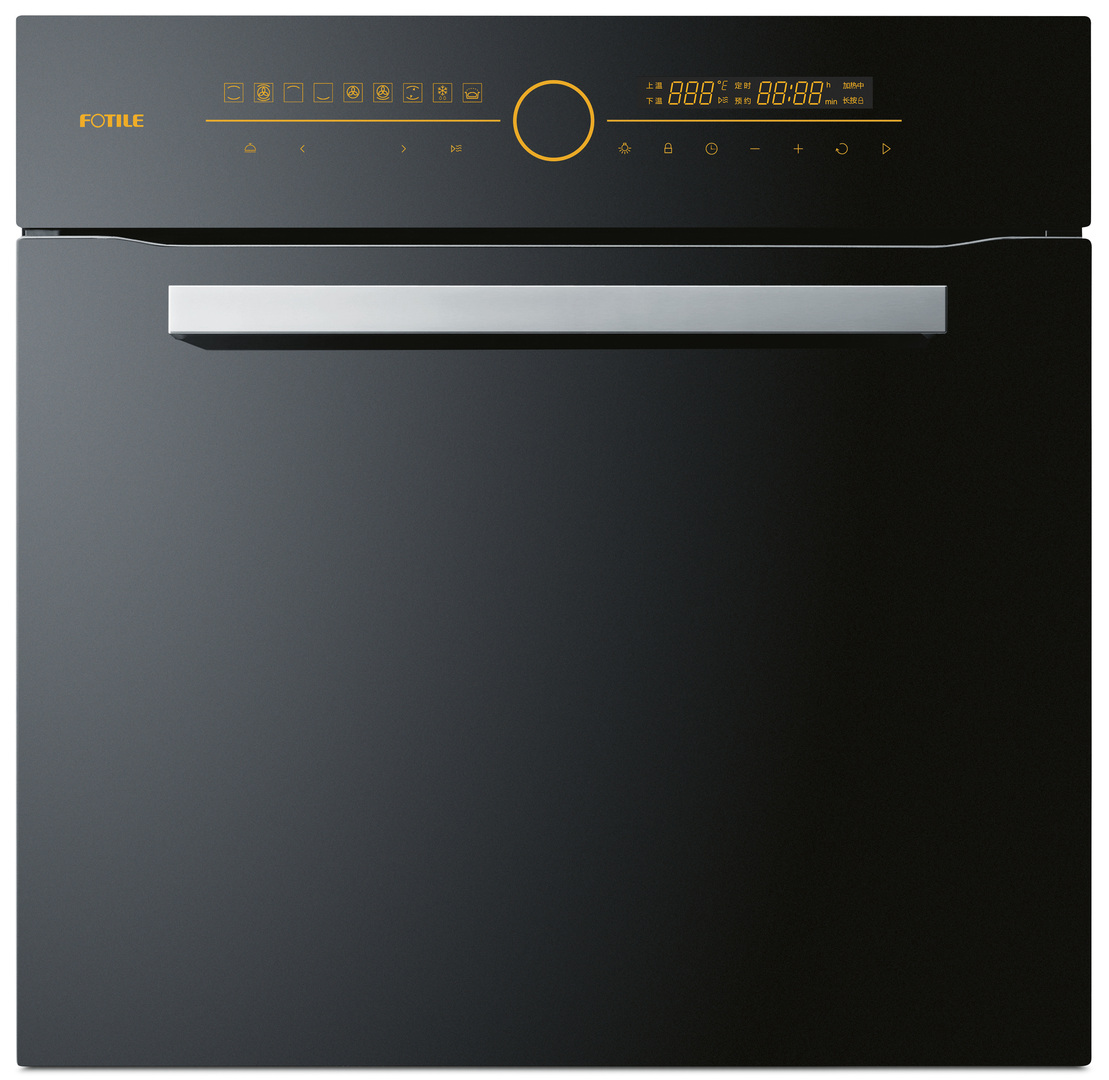 Die gelb leuchtenden LED-Symbole der Bedienfläche bilden bei diesem Backofen einen markanten Kontrast zur dunklen Glasfront und rücken so in den Mittelpunkt der Aufmerksamkeit.