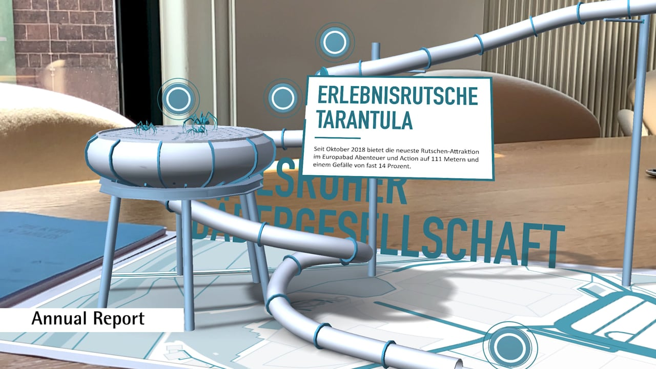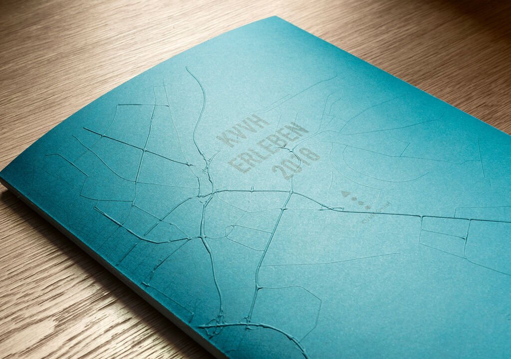 KVVH, the Karlsruher Versorgungs-, Verkehrs- und Hafengesellschaften Group, is a municipal service group providing electricity, natural gas and drinking water, as well as operating public transport, road and tunnel construction and the Rhine ports. In order to present this group as flexible, service-oriented and forward-looking, the 2018 annual report consists of two complementary elements: the classic analogue print product in the form of a slim brochure containing the essential content and a digital world of experience in the form of an augmented reality app. Opening the cover of the gaudy turquoise report directly reveals the big map on the inside, which turns the annual report into a stage by means of an app. The instance it is activated on a smartphone, ships are moving across paper pages, buildings are casting their shadows on the table or the floor is tearing open making fountain lines. With an experience that is three-dimensionally tangible from any angle, viewers thus become interactive directors able to playfully satisfy their needs for information at any time.