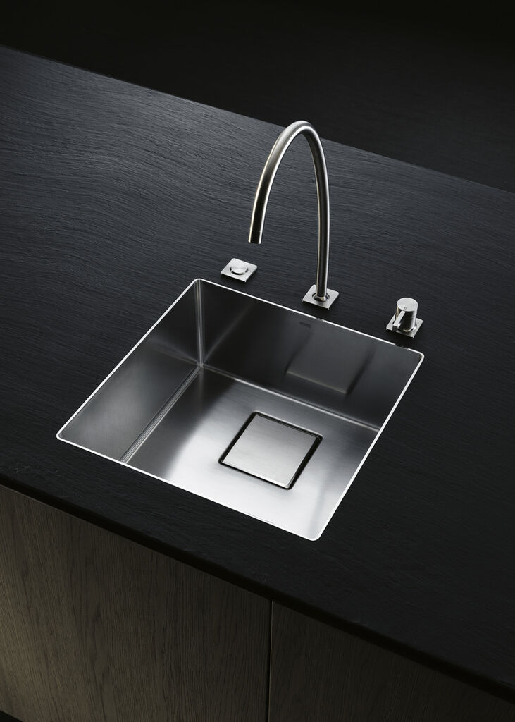 Bei dieser Spüle mit passender Armatur fällt die präzise Fertigung auf, die in allen Details sichtbar wird. KWC Era besticht zudem mit einem hohen Maß an Klarheit und Geradlinigkeit.